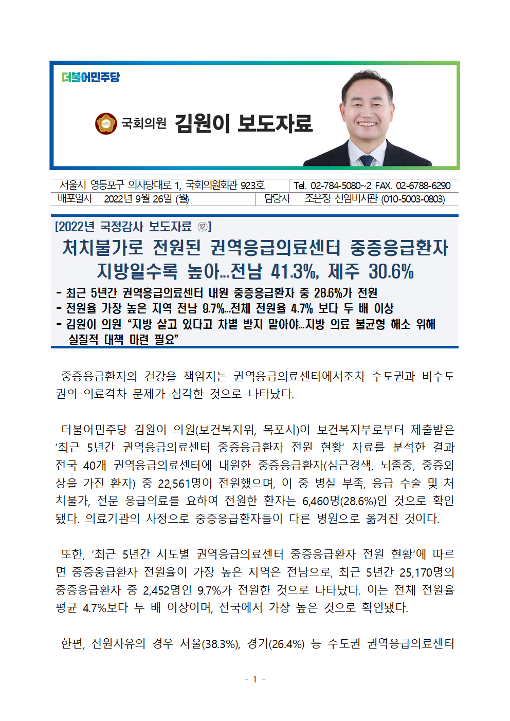 김원이의원_보도자료_12번_처치불가로_전원된_권역응급의료센터_중증응급환자_지방일수록_높아_220926.hwp