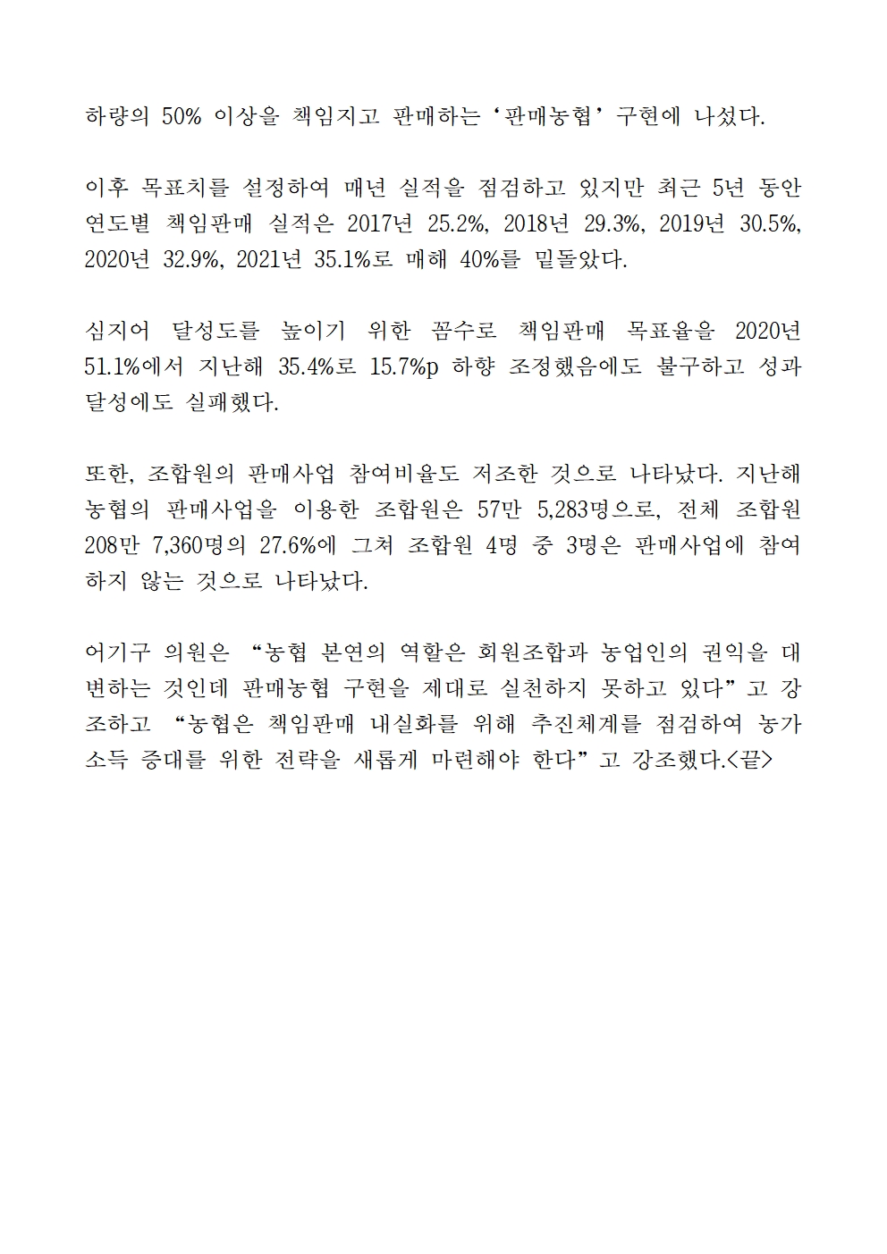 [어기구의원 국정감사 보도자료] 농협, 조합원 위한 ‘판매농협’ 구현 역부족