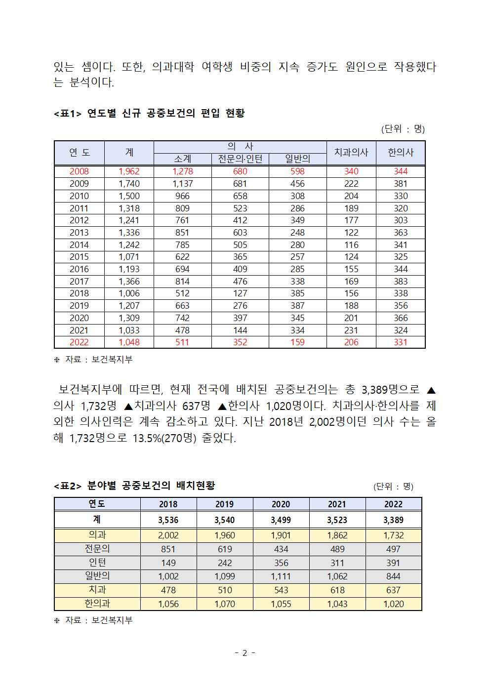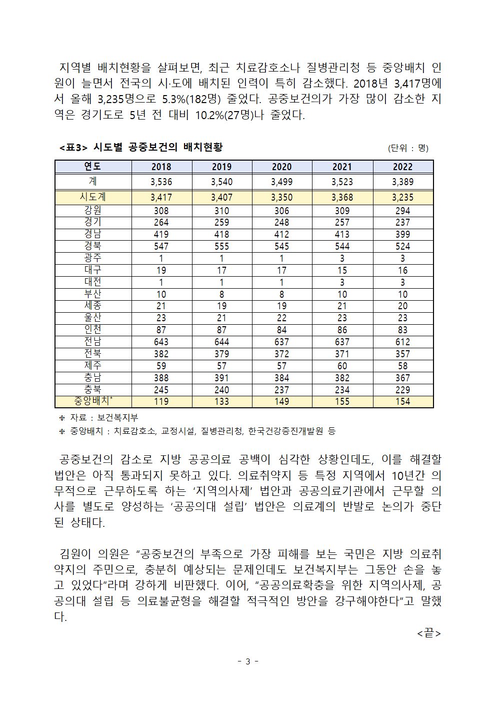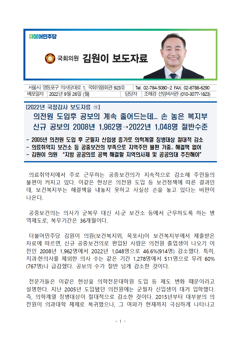 [김원이의원 보도자료] 의전원 도입 후 공보의 줄어드는데 손놓은 복지부