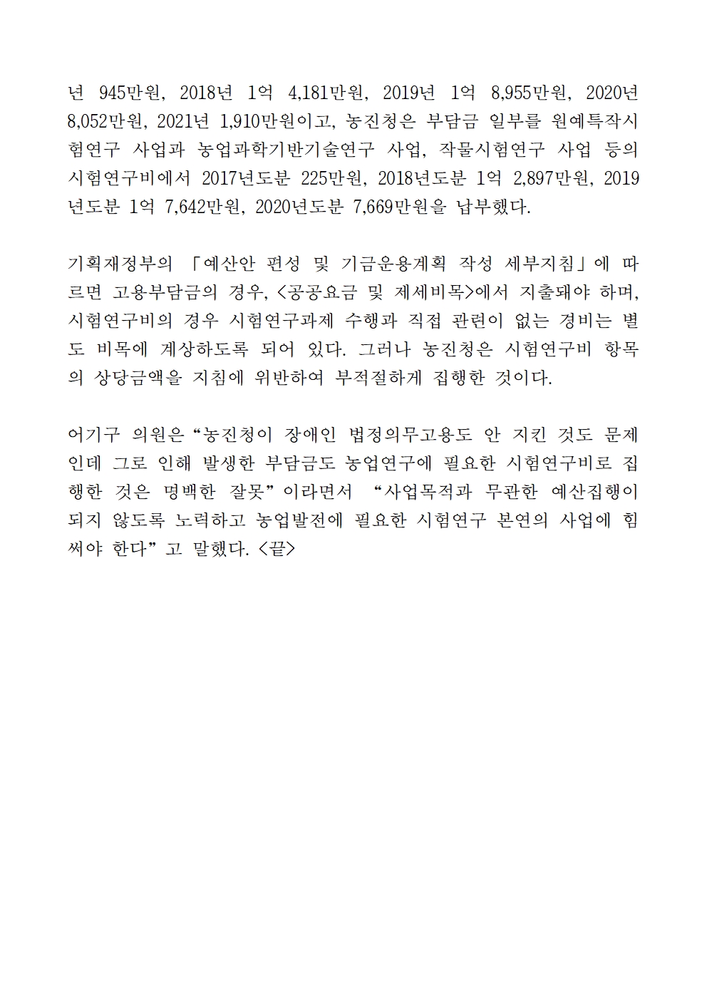 [어기구의원 국정감사 보도자료] 농촌진흥청, 장애인고용부담금을 ‘시험연구비’로 납부