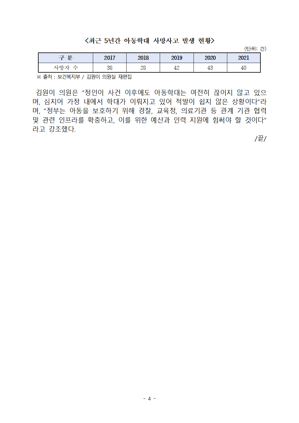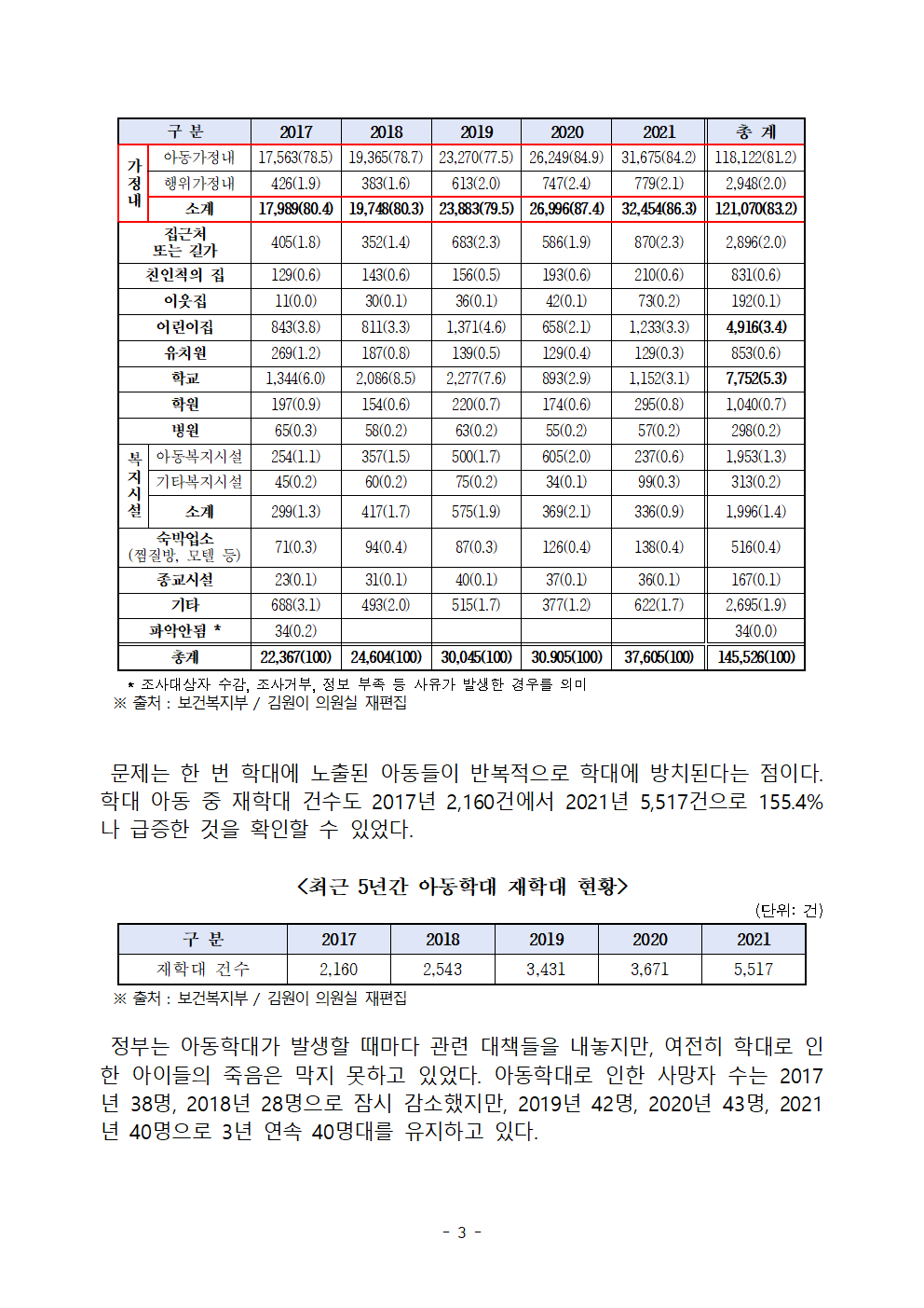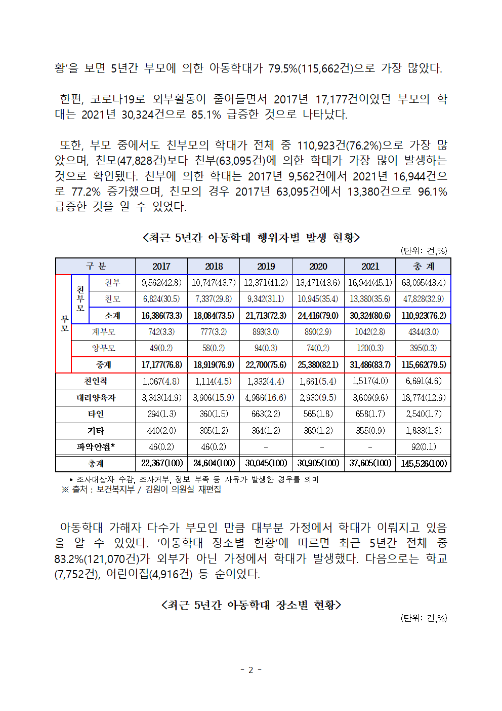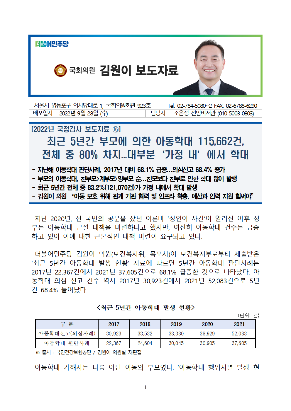 [김원이의원 보도자료] 최근 5년간 부모에 의한 아동학대 115,662건, 전체 중 80% 차지