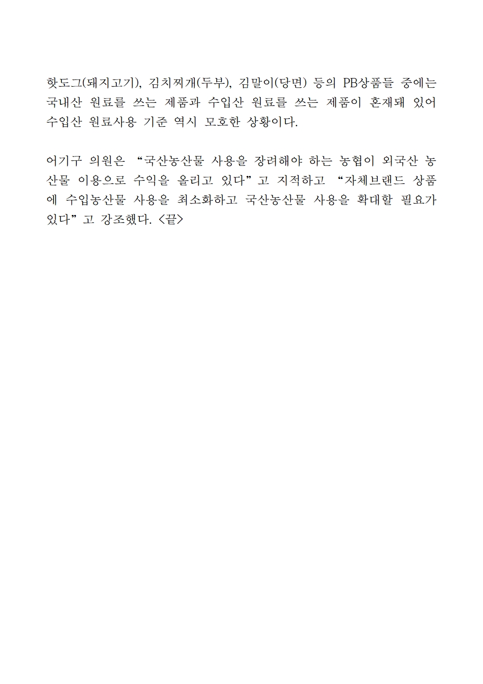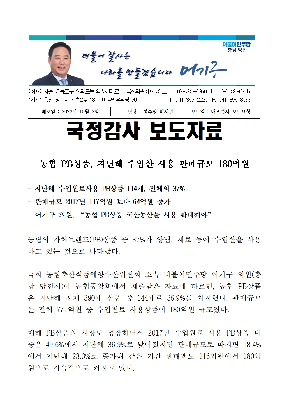 221002어기구의원_국정감사_보도자료_농협_PB상품,_지난해_수입산_사용_판매규모_180억원.hwp