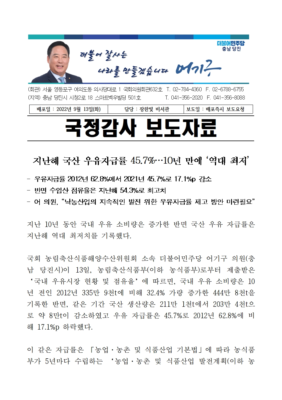 220913_어기구의원_국정감사_보도자료_지난해_국산_우유자급률_45_7%…10년_만에_‘역대_최저’.hwp