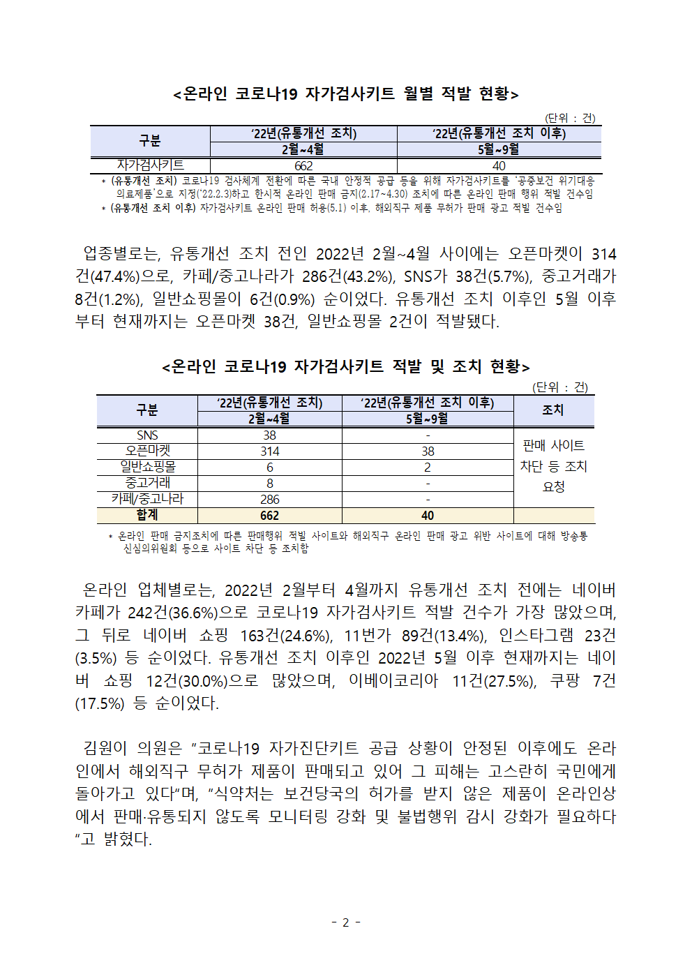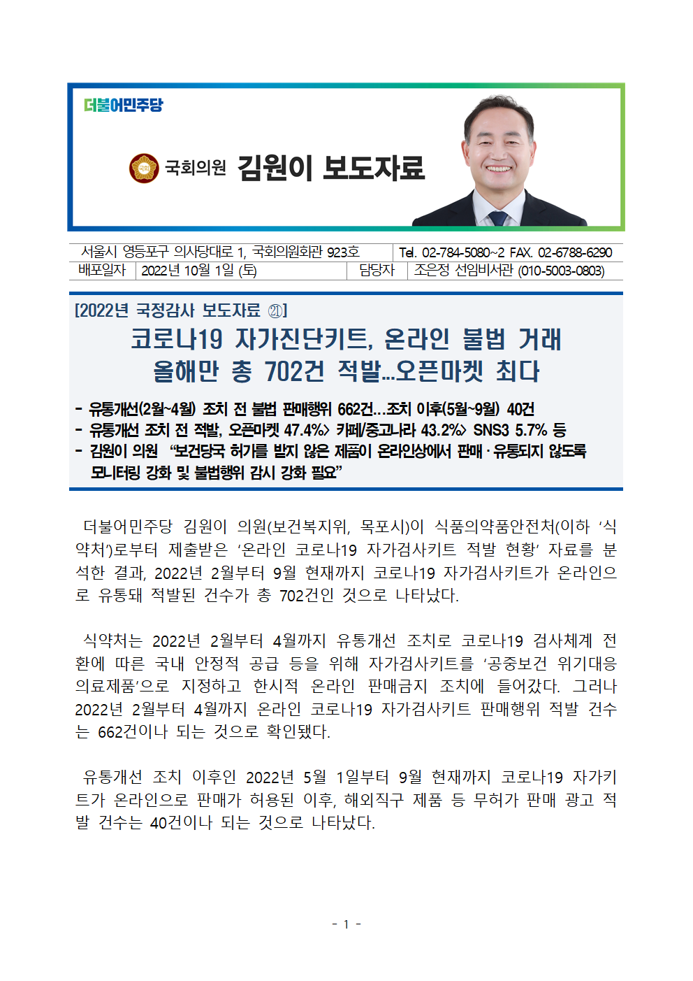 [김원이의원 보도자료] 코로나19 자가진단키트, 온라인 불법 거래 올해만 총 702건 적발