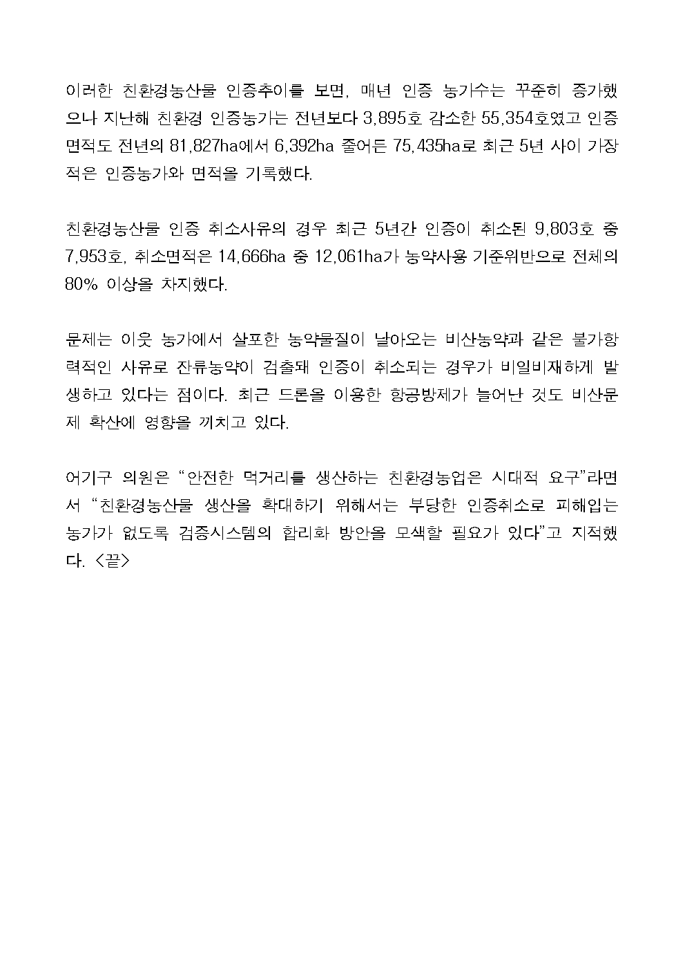 [어기구의원 국정감사 보도자료] 최근 5년간 친환경인증 취소농가 9,803호 달해