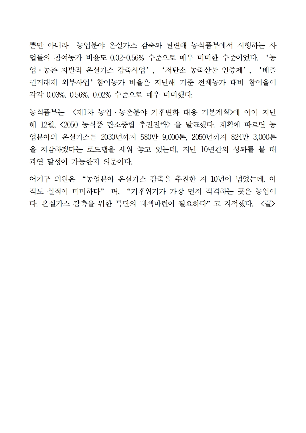 [어기구의원 국정감사 보도자료] 최근 10년간 농업부문 온실가스 감축량 1% 이하