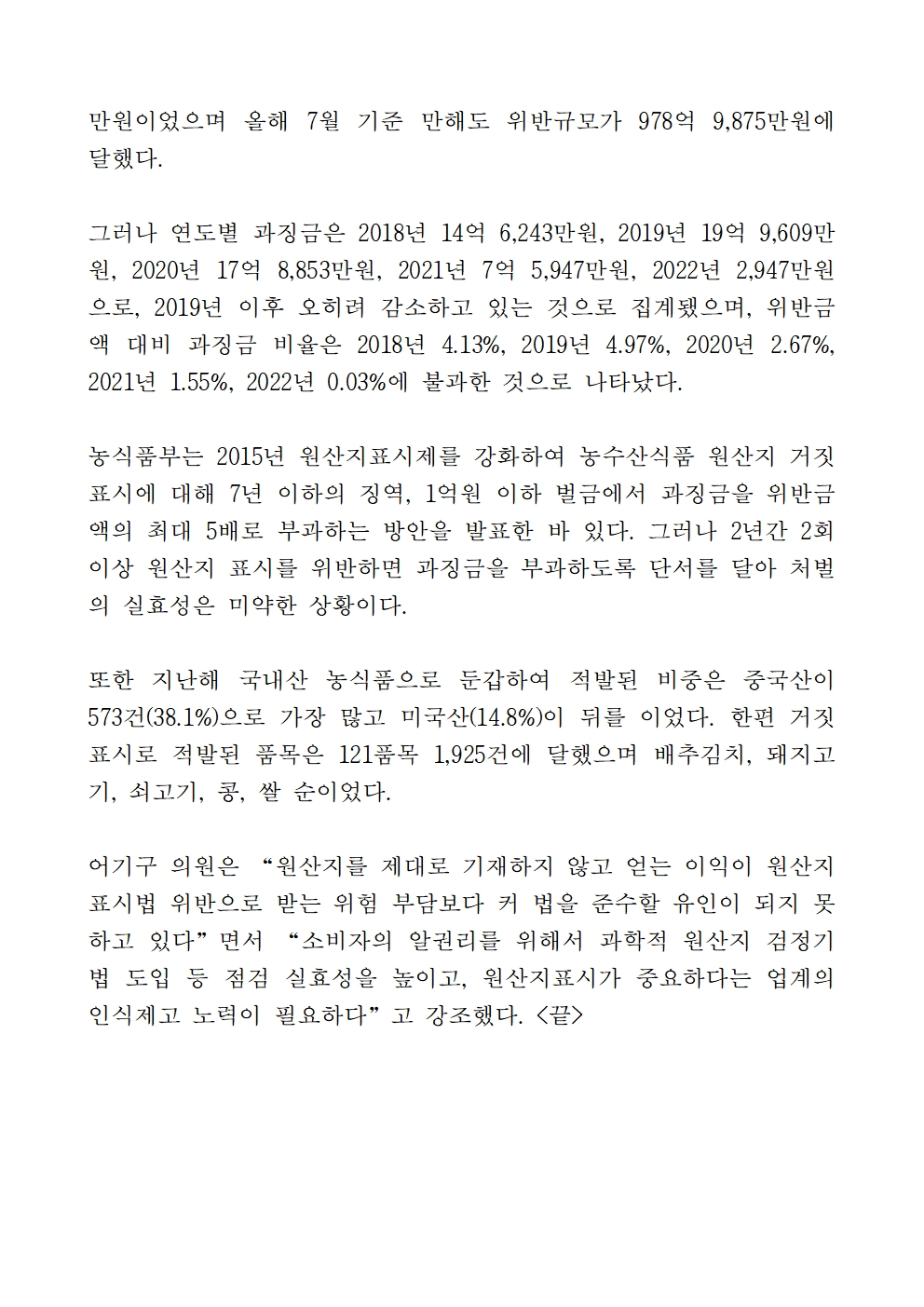 [어기구의원 국정감사 보도자료] 최근 5년간 농식품 원산지표시 위반 2,300억원 규모