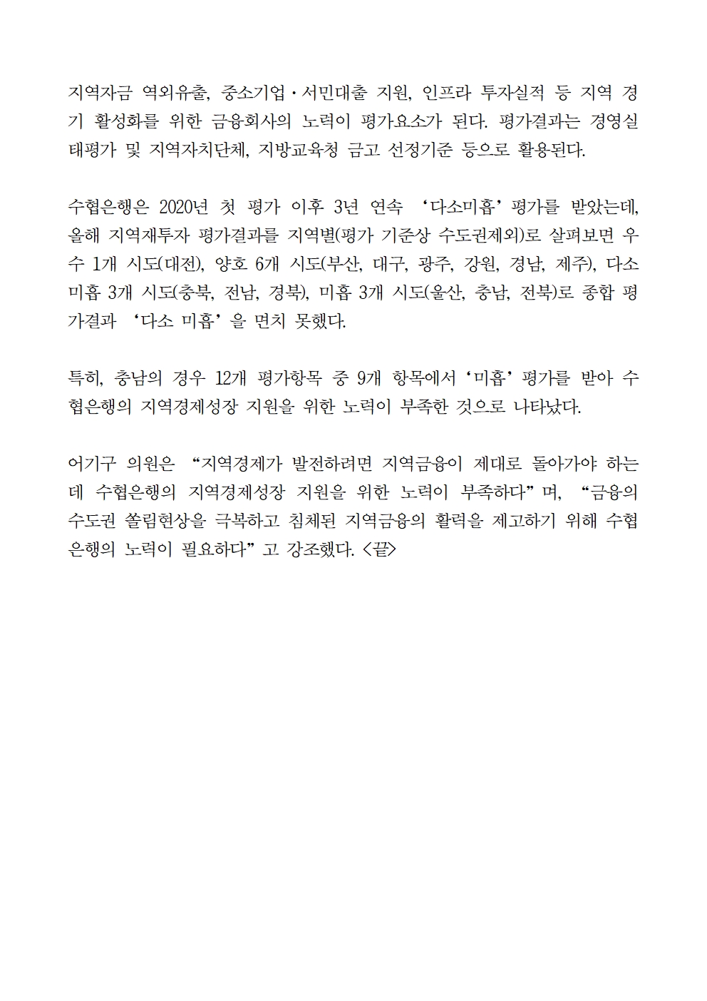 [어기구의원 국정감사 보도자료] 수협은행, 지역재투자 평가 3년 연속 초라한 성적