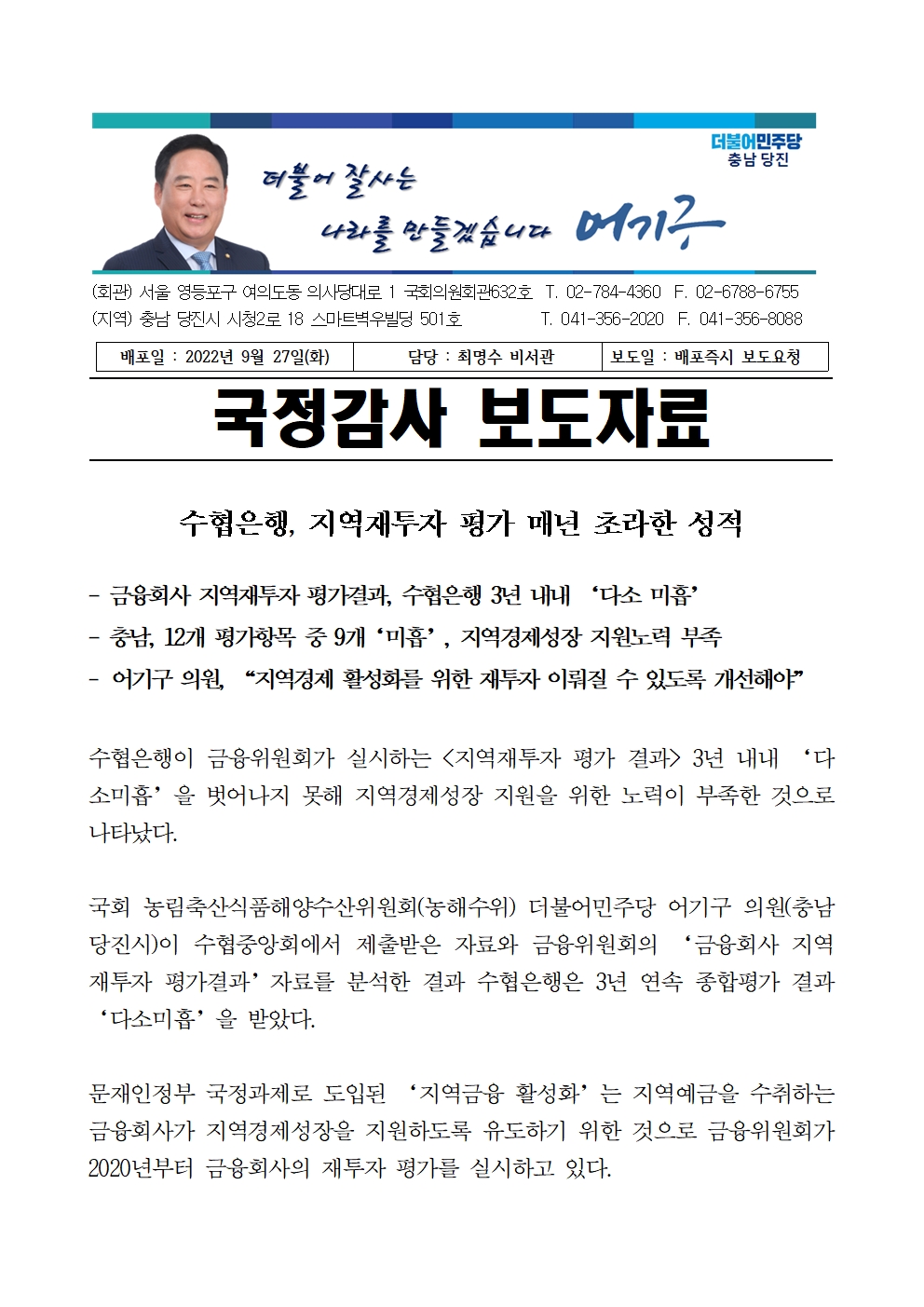 220927_어기구의원_국정감사_보도자료_수협은행,_지역재투자_평가_3년_연속_초라한_성적.hwp