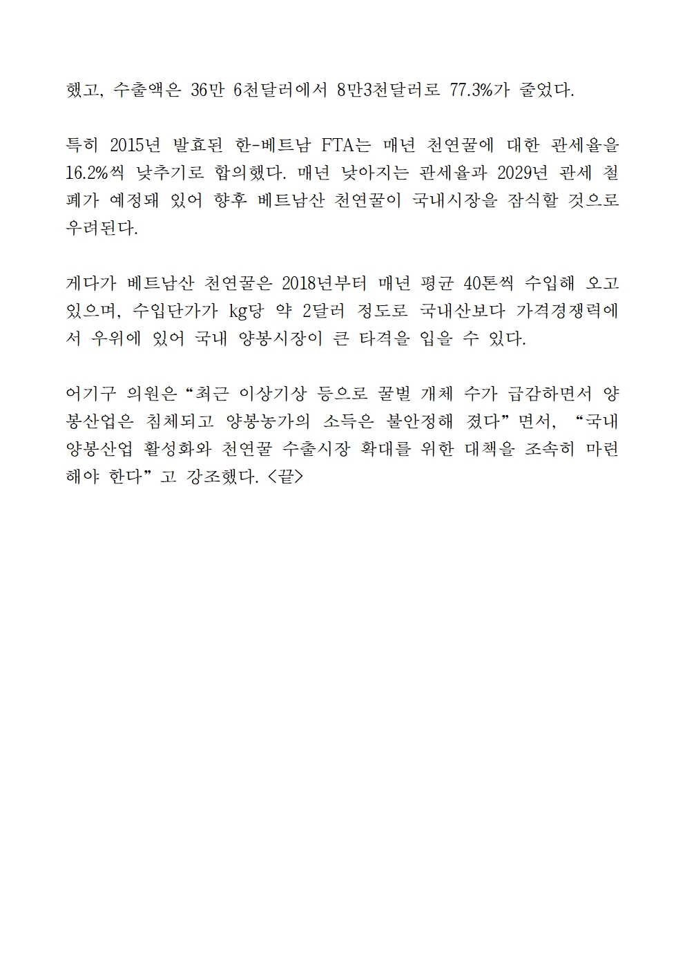 [어기구의원 국정감사 보도자료] 위기의 양봉산업, 최근 5년간 국산 천연꿀 수출량 91% 감소