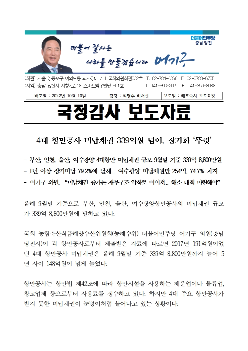 221010어기구의원_국정감사_보도자료_4대_항만공사_미납채권_339억원_넘어,_장기화_‘뚜렷’.hwp