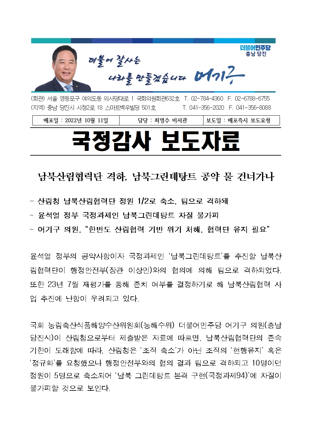 221011어기구의원_국감감사_보도자료_남북산림협력단_격하,_남북그린데탕트_공약_물_건너가나.hwp