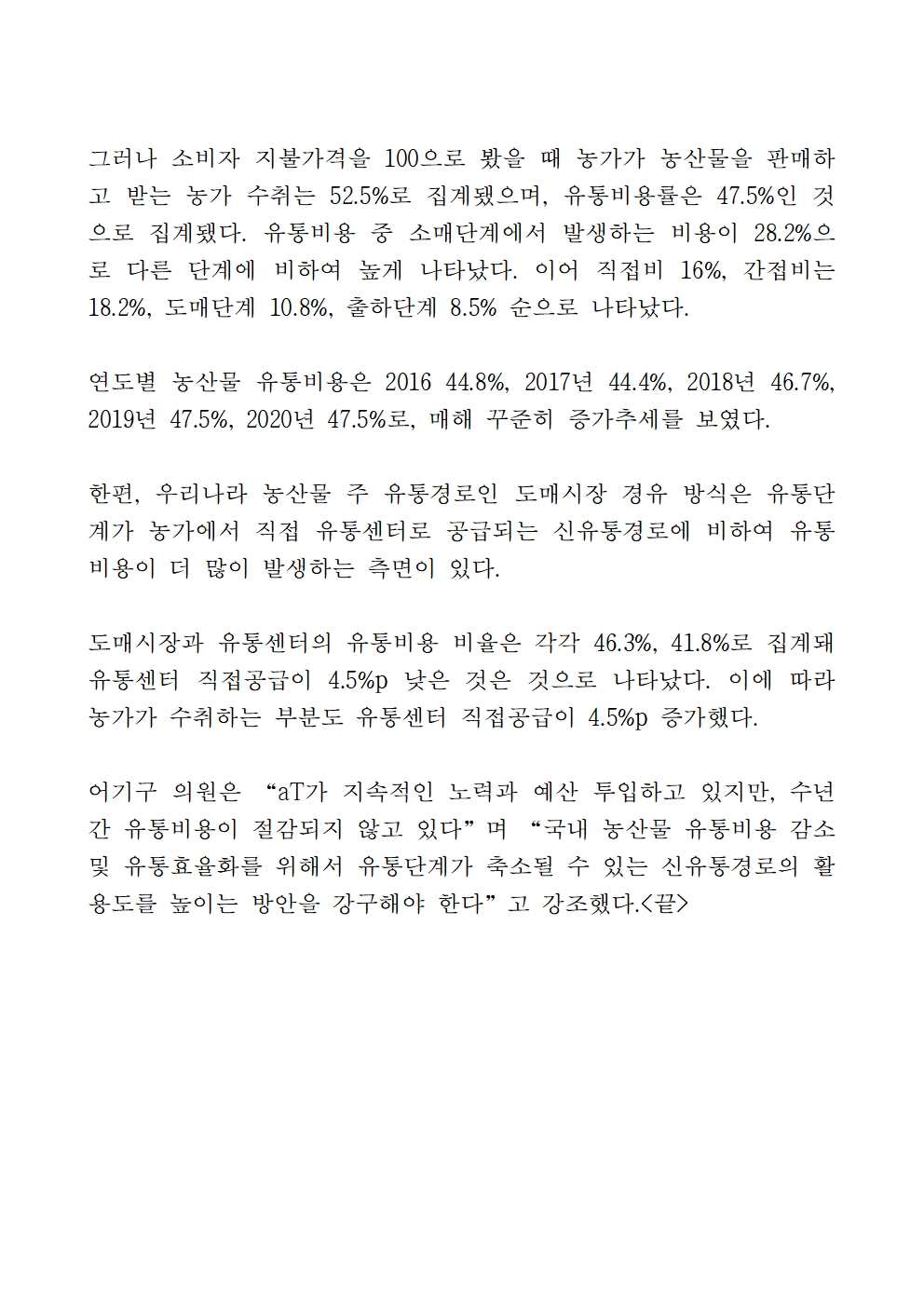 [어기구의원 국정감사 보도자료] 농산물 1000원에 팔면 농민 몫은 525원…양파는 183원 불과