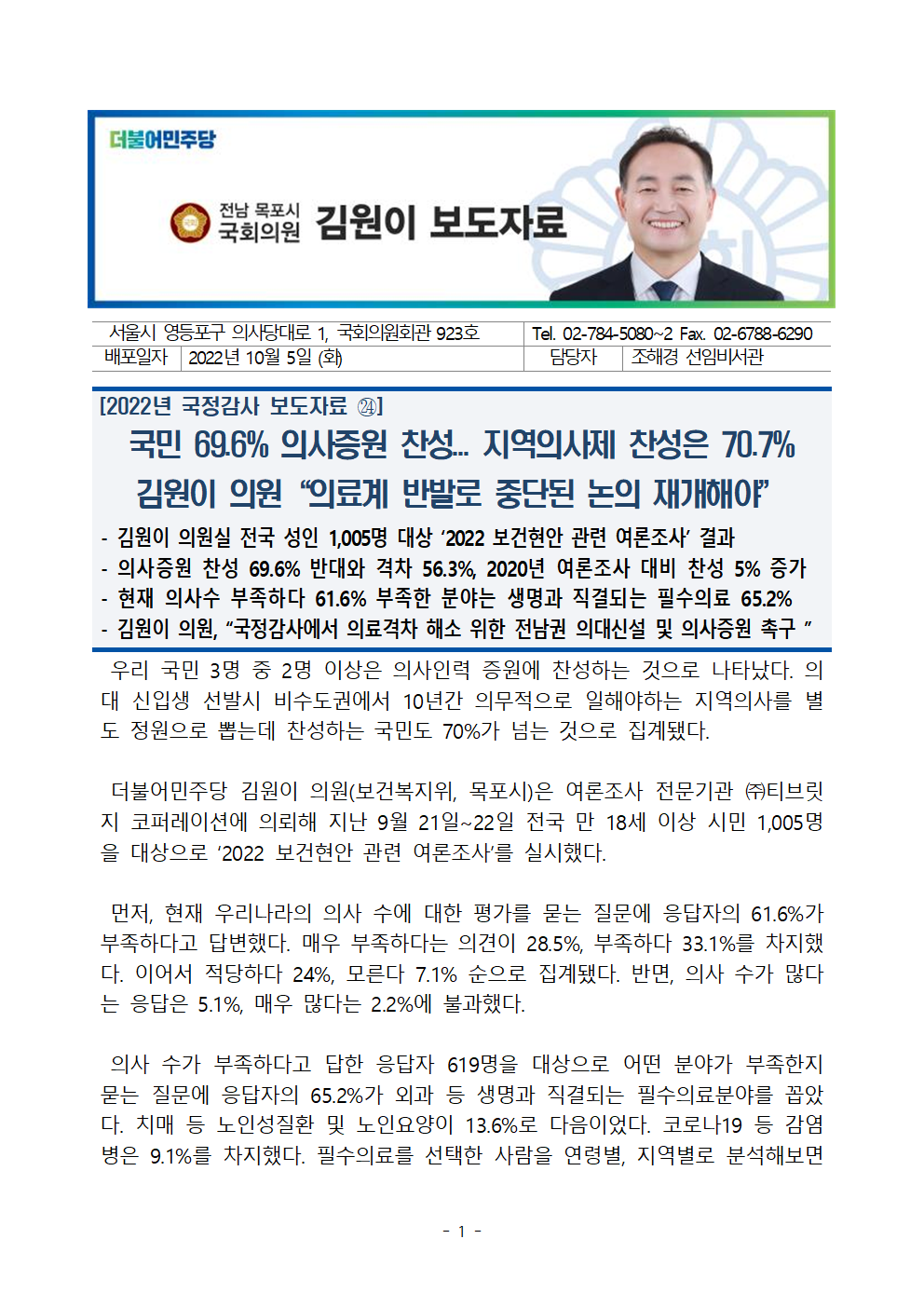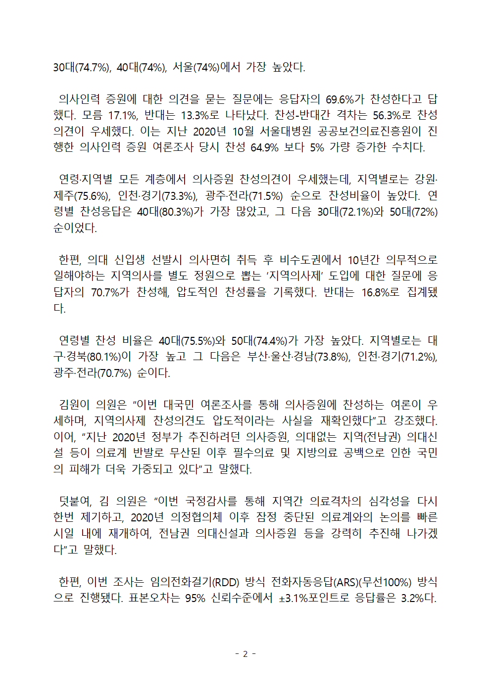 [김원이의원 보도자료] 국민 69.6% 의사증원 찬성... 지역의사제 찬성은 70.7%