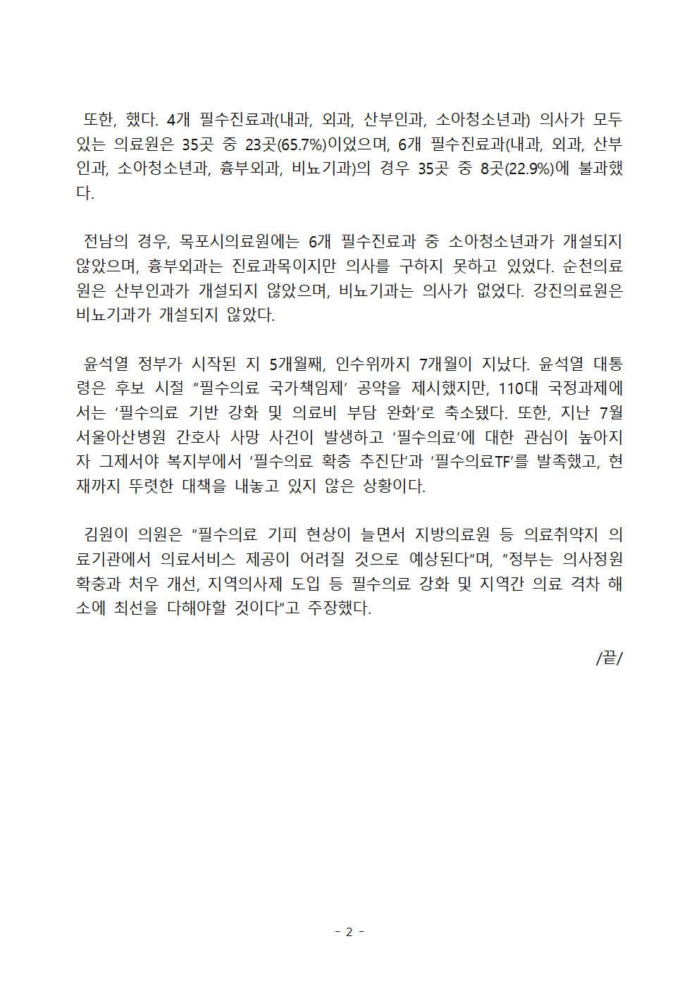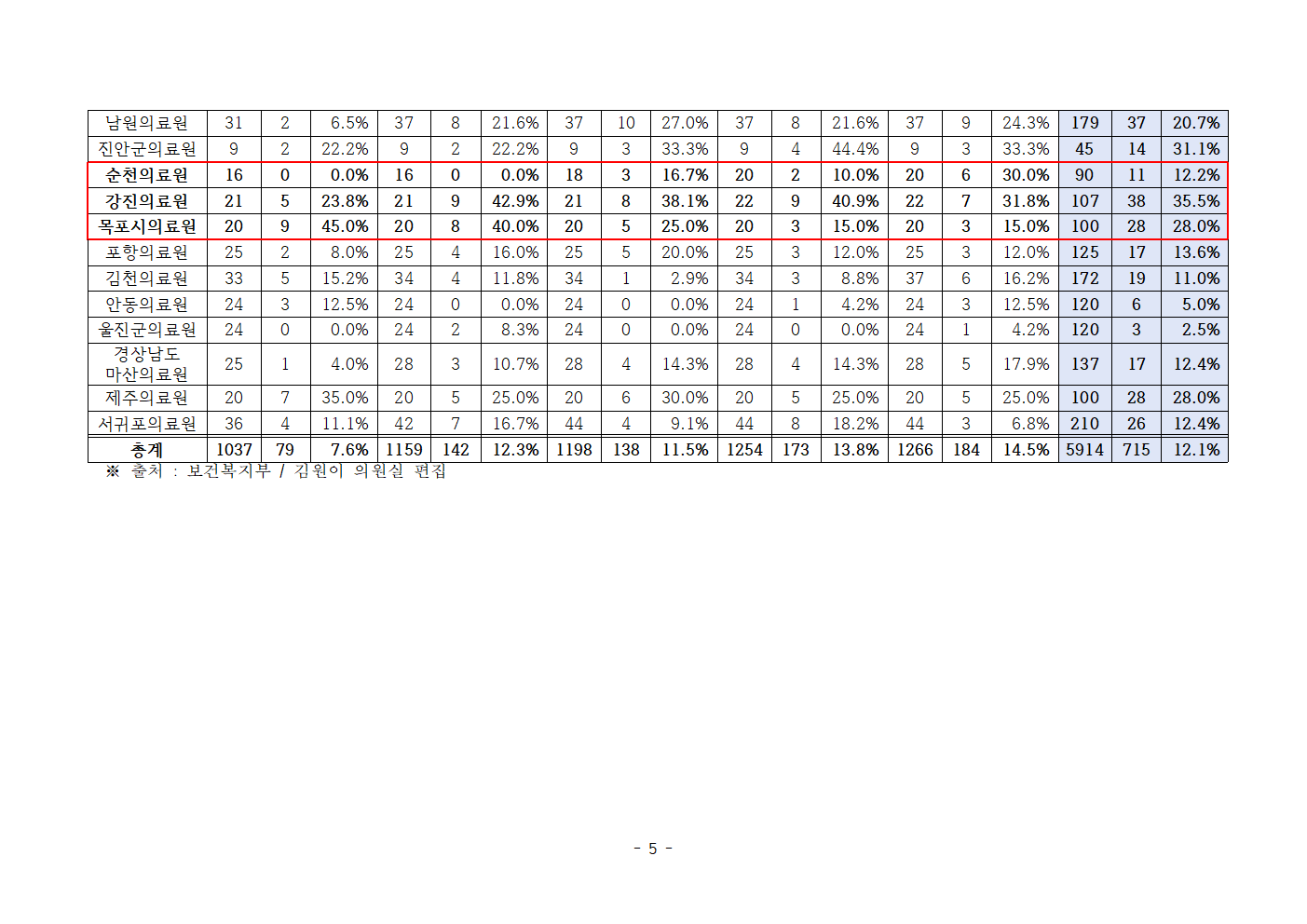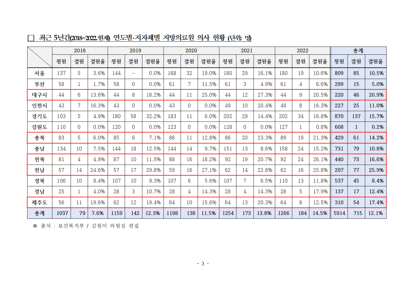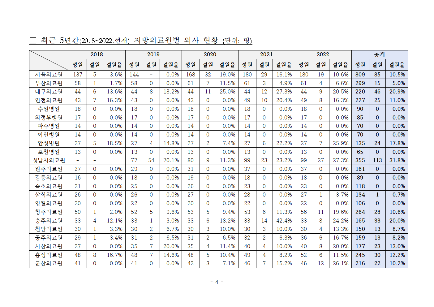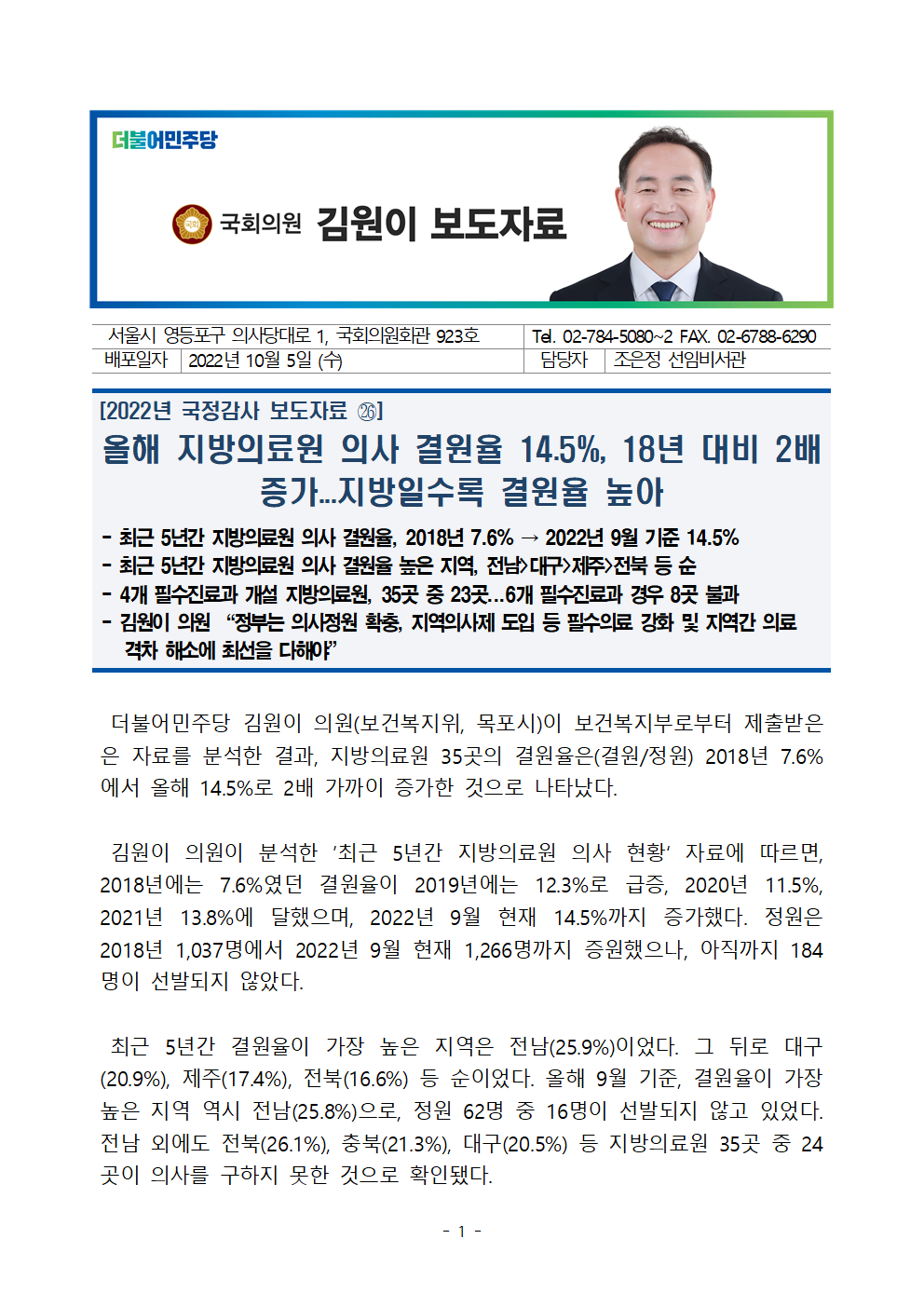 [김원이의원 보도자료] 올해 지방의료원 의사 결원율 14.5%, 18년 대비 2배 증가...지방일수록 결원율 높아