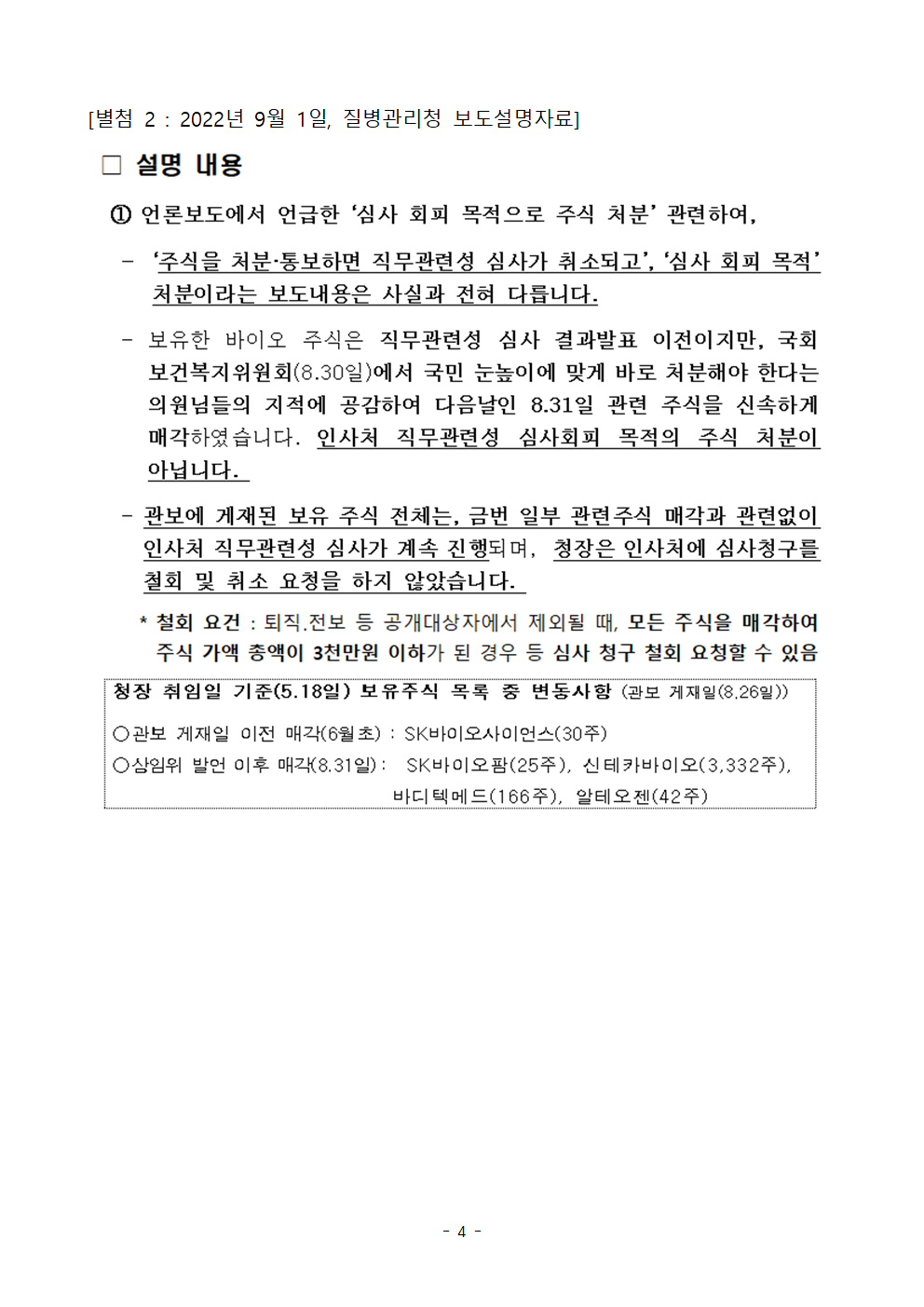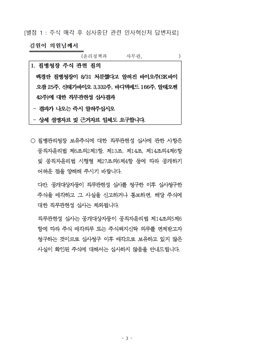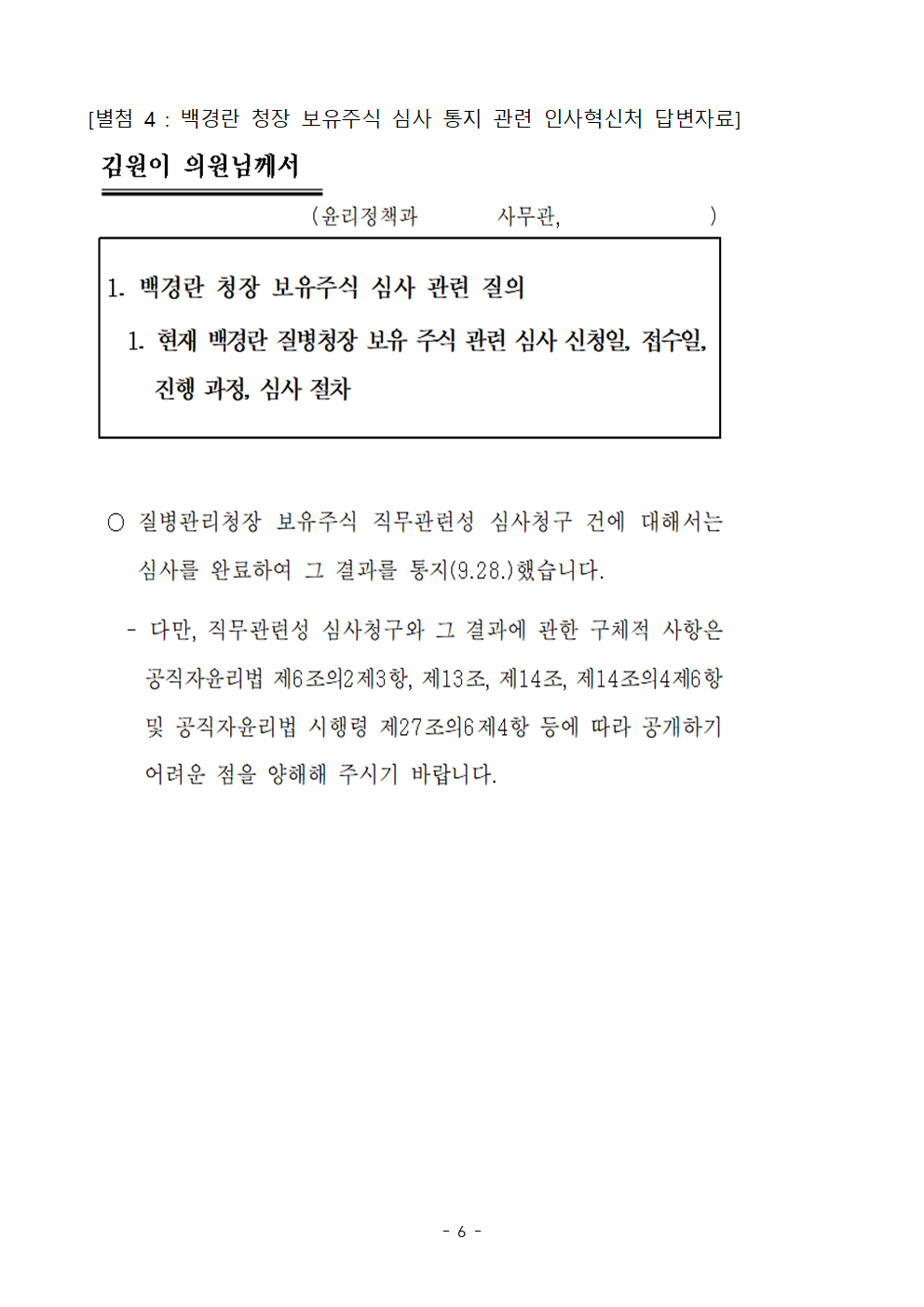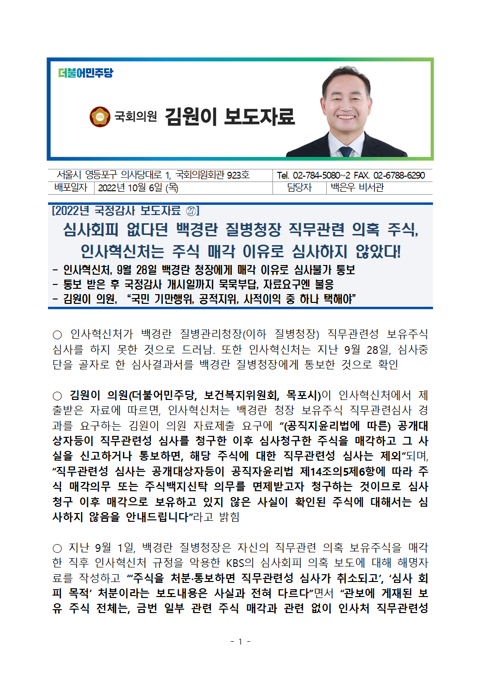 김원이의원_보도자료_27번_심사회피_없다던_백경란_질병청장_직무관련_의혹_주식,_인사혁신처는_주식_매각_이유로_심사하지_않았다!.hwp