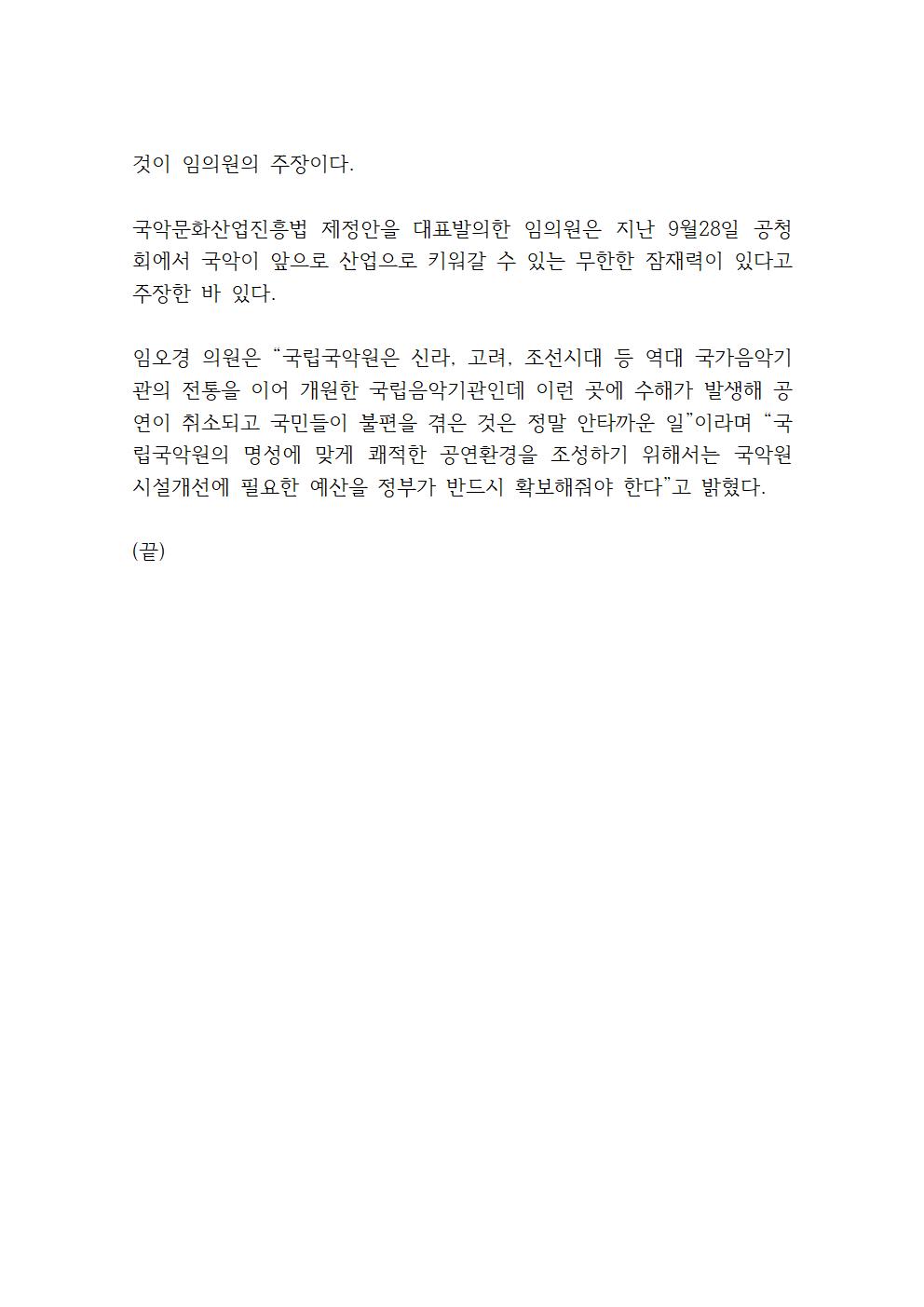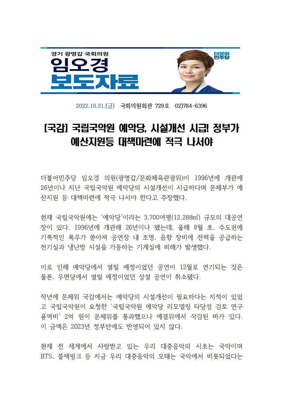 [임오경의원 보도자료]국립국악원 예악당, 시설개선 시급! 정부가 예산지원등 대책마련에 적극 나서야
