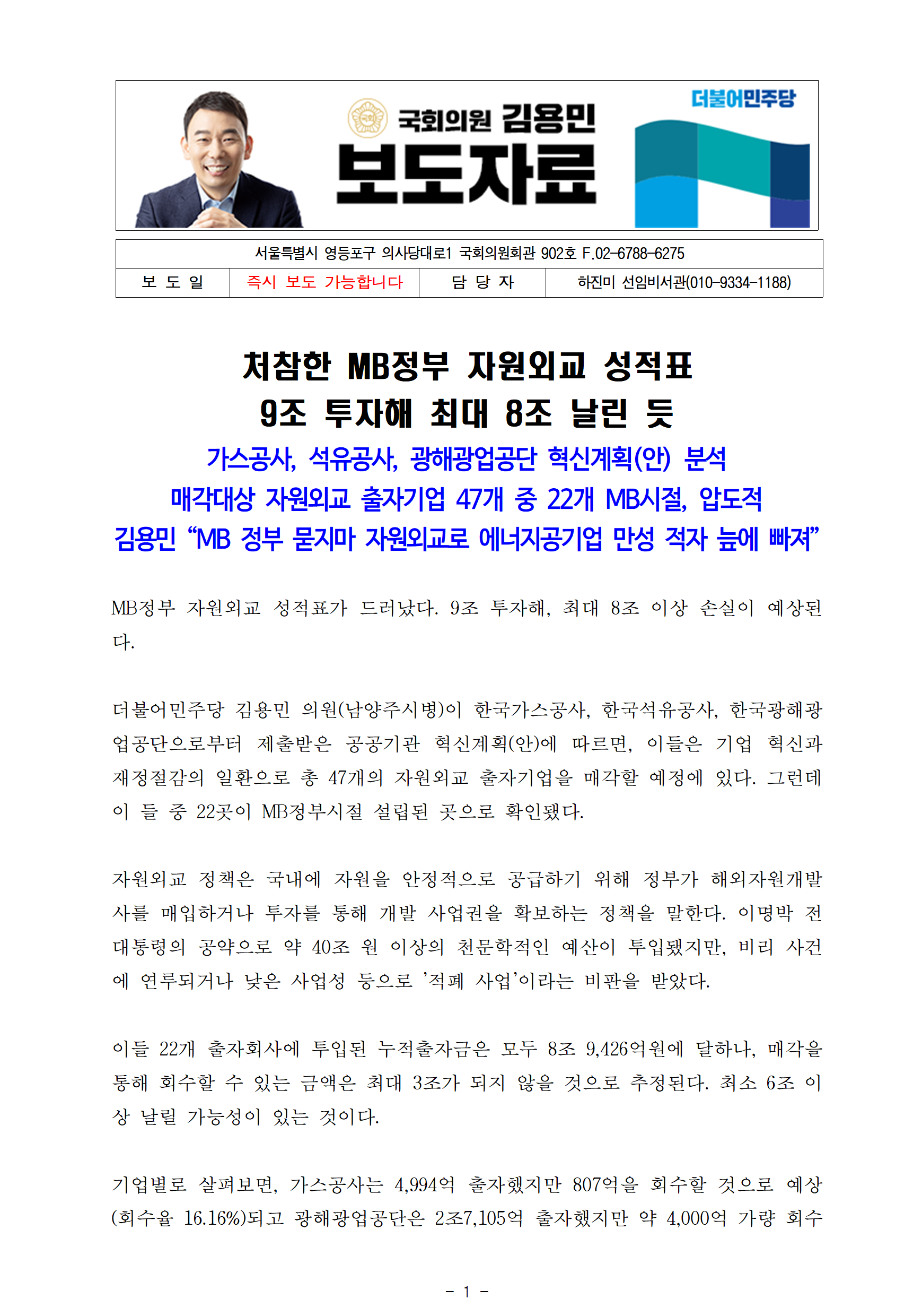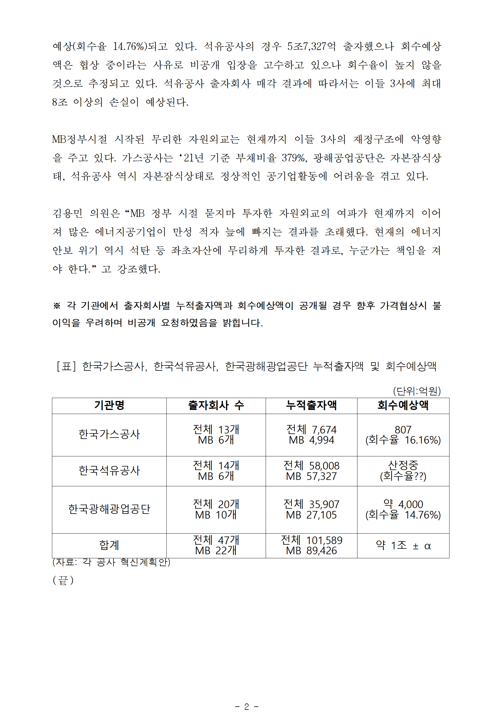 [김용민의원실 보도자료] 처참한 MB정부 자원외교 성적표 9조 투자해 최대 8조 날린 듯