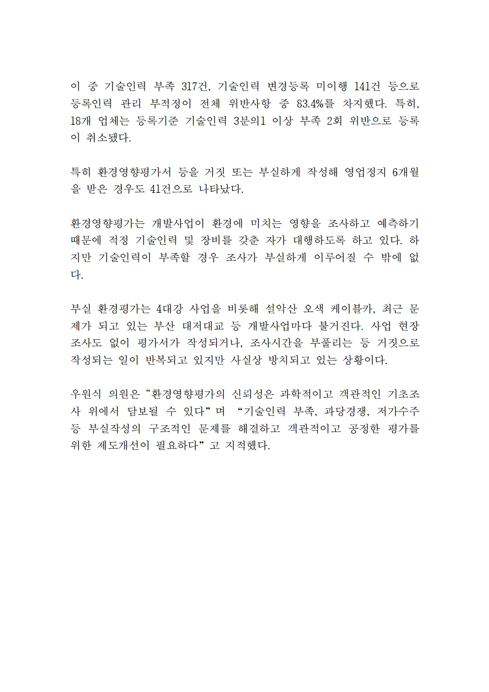 [우원식 의원 보도자료]최근 5년 간 환경영향평가법 252개 업체 549건 위반