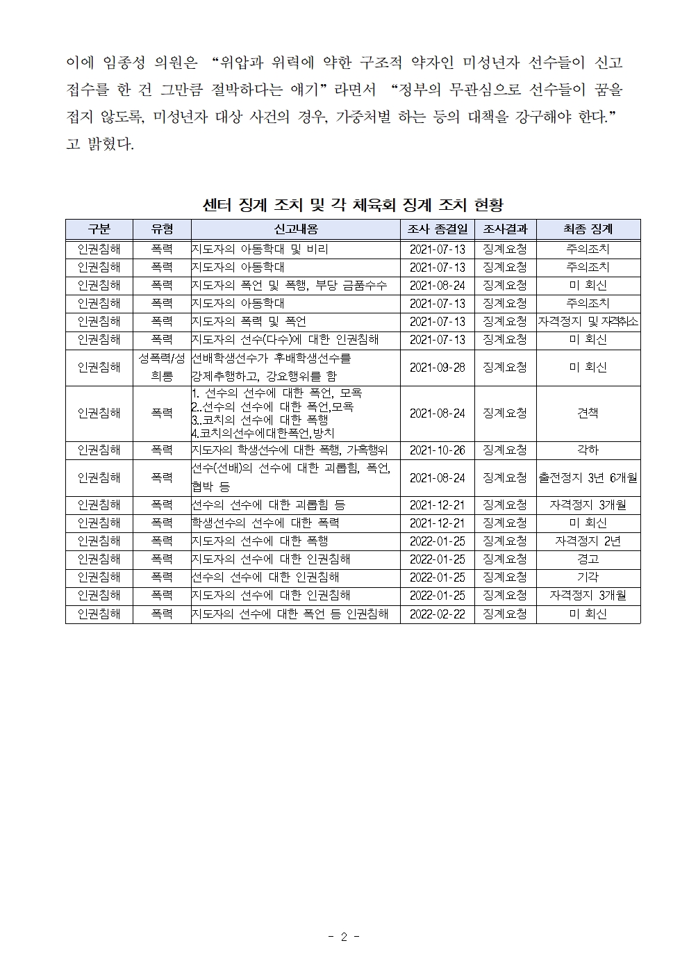 221024_보도자료_최종_스포츠윤리센터_인권침해_신고_3건_중_1건은_미성년자_대상_(임종성의원).hwp