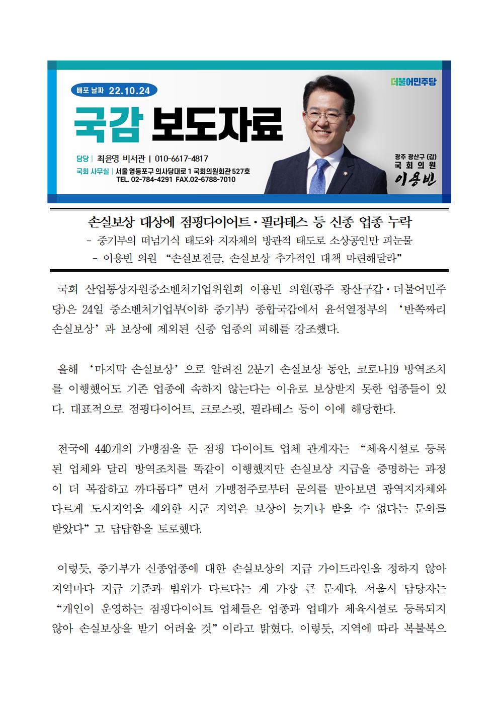 1024국감보도자료_손실보상_대상에_점핑다이어트·필라테스_등_신종_업종_누락.hwp