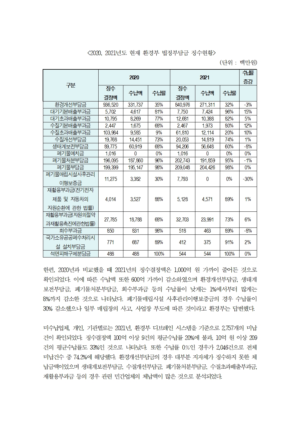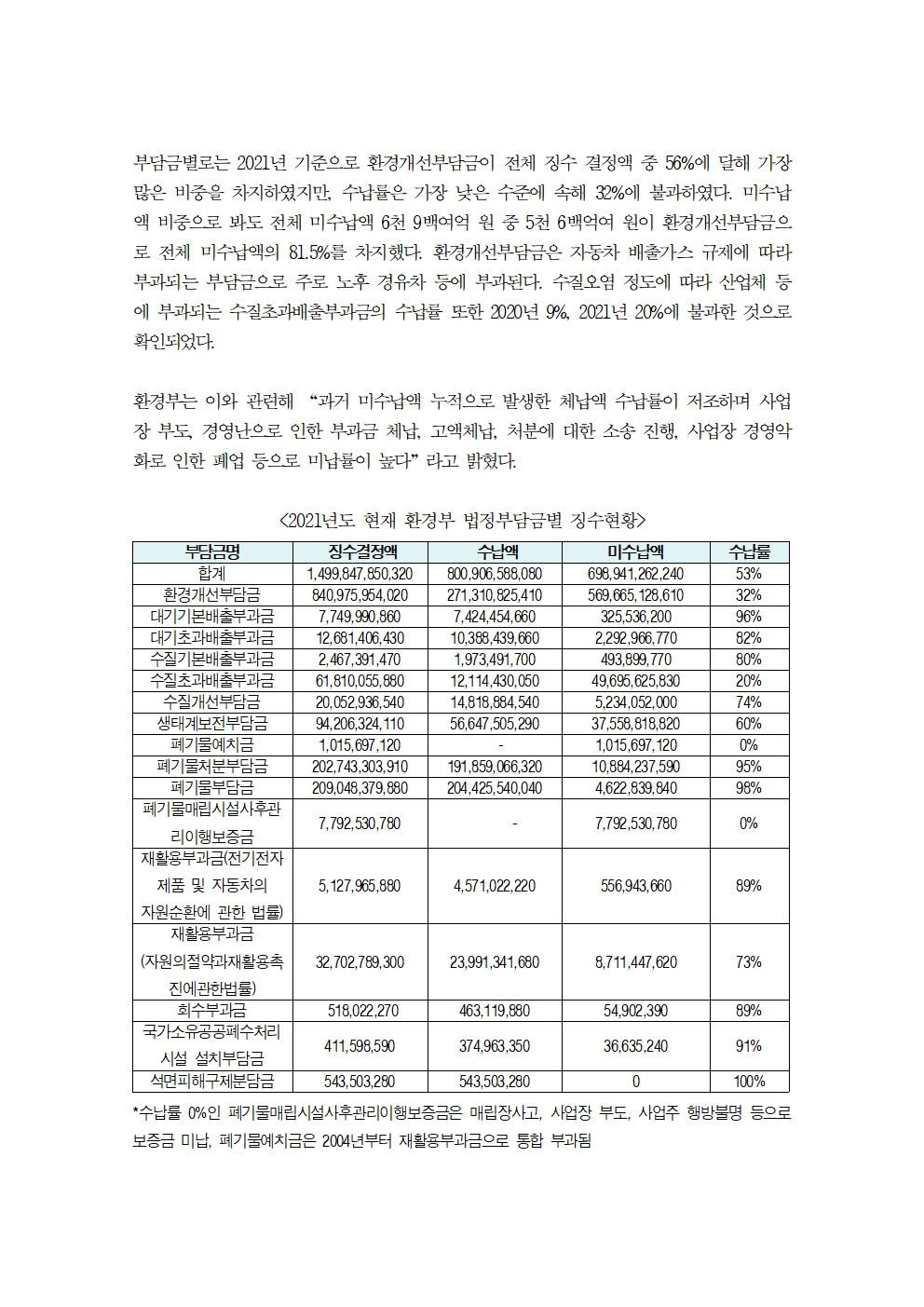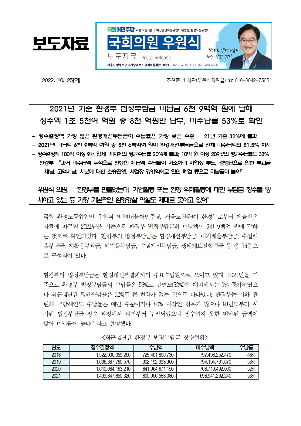 [우원식 의원 보도자료] 2021년 기준 환경부 법정부담금 미납금 6천 9백억 원에 달해 징수액 1조 5천여 억원 중 8천 억원만 납부, 미수납률 53%로 확인