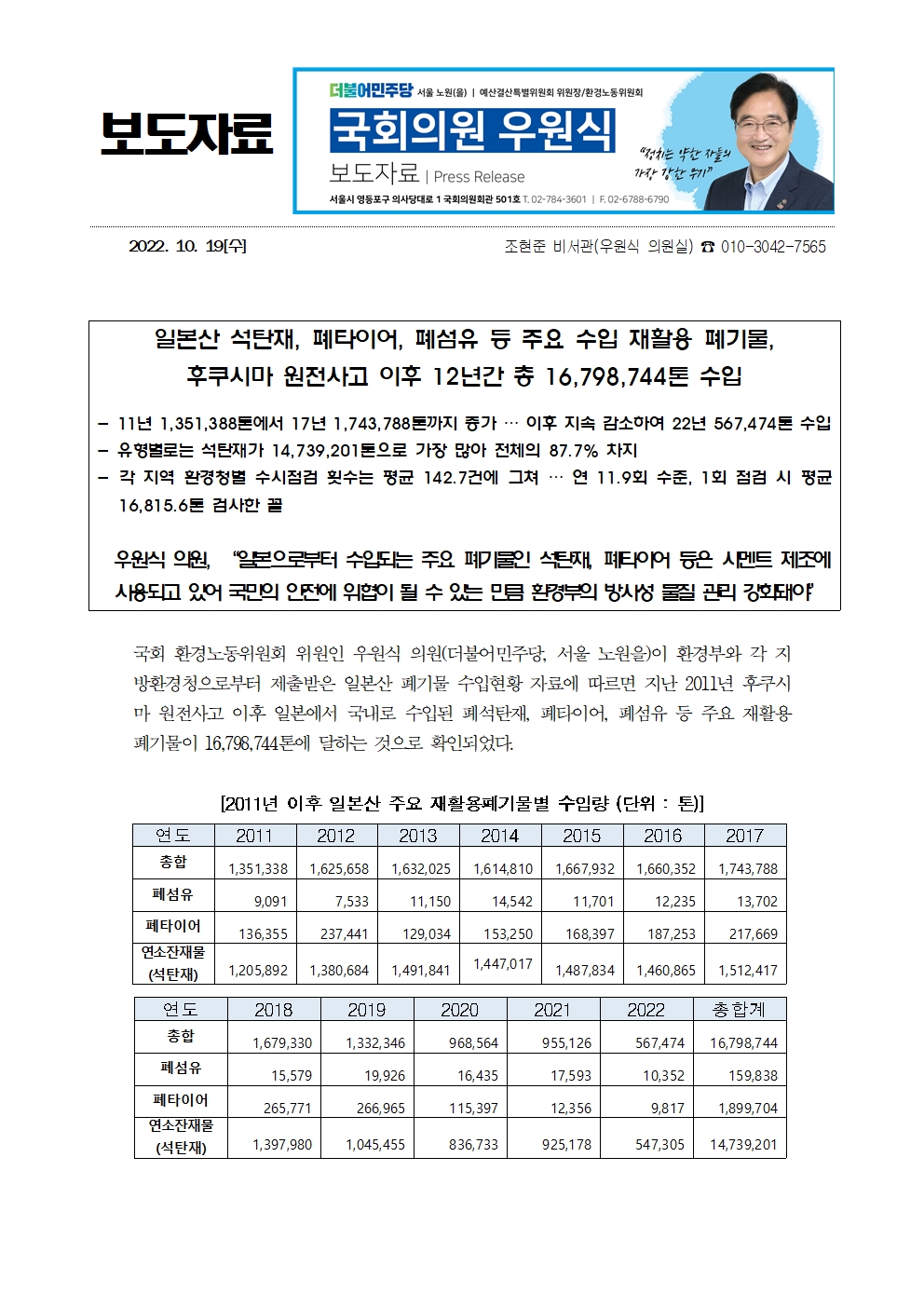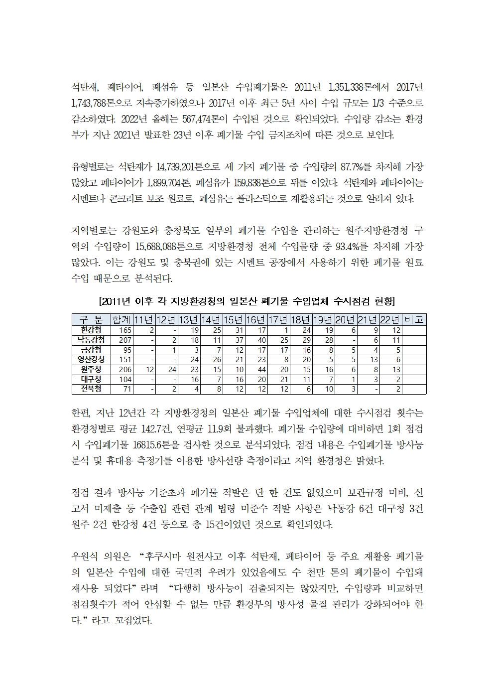 [우원식 의원 보도자료] 일본산 석탄재, 폐타이어, 폐섬유 등 주요 수입 재활용 폐기물, 후쿠시마 원전사고 이후 12년간 총 16,798,744톤 수입