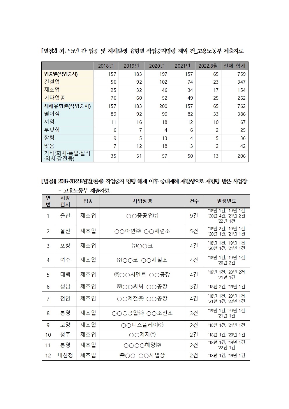 220918_보도자료_고용노동부_최근_5년_간_발생한_중대재해_사업장_중_5분의1은_작업중지명령_조차_시행_안해_최종.hwp