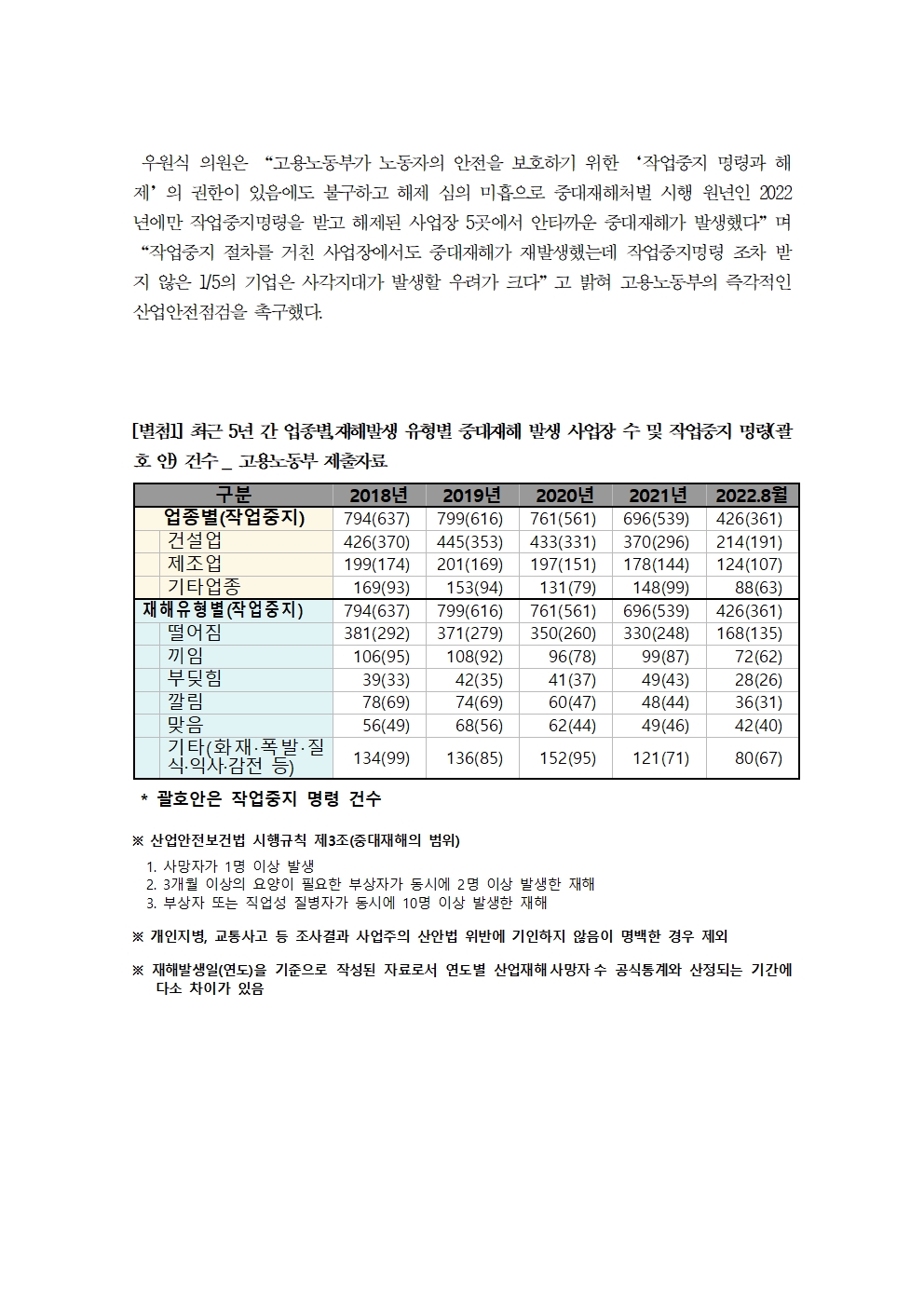 [우원식 의원 보도자료] 고용노동부, 최근 5년 간 발생한 중대재해 사업장 중 1/5는 작업중지명령 조차 시행 안해
