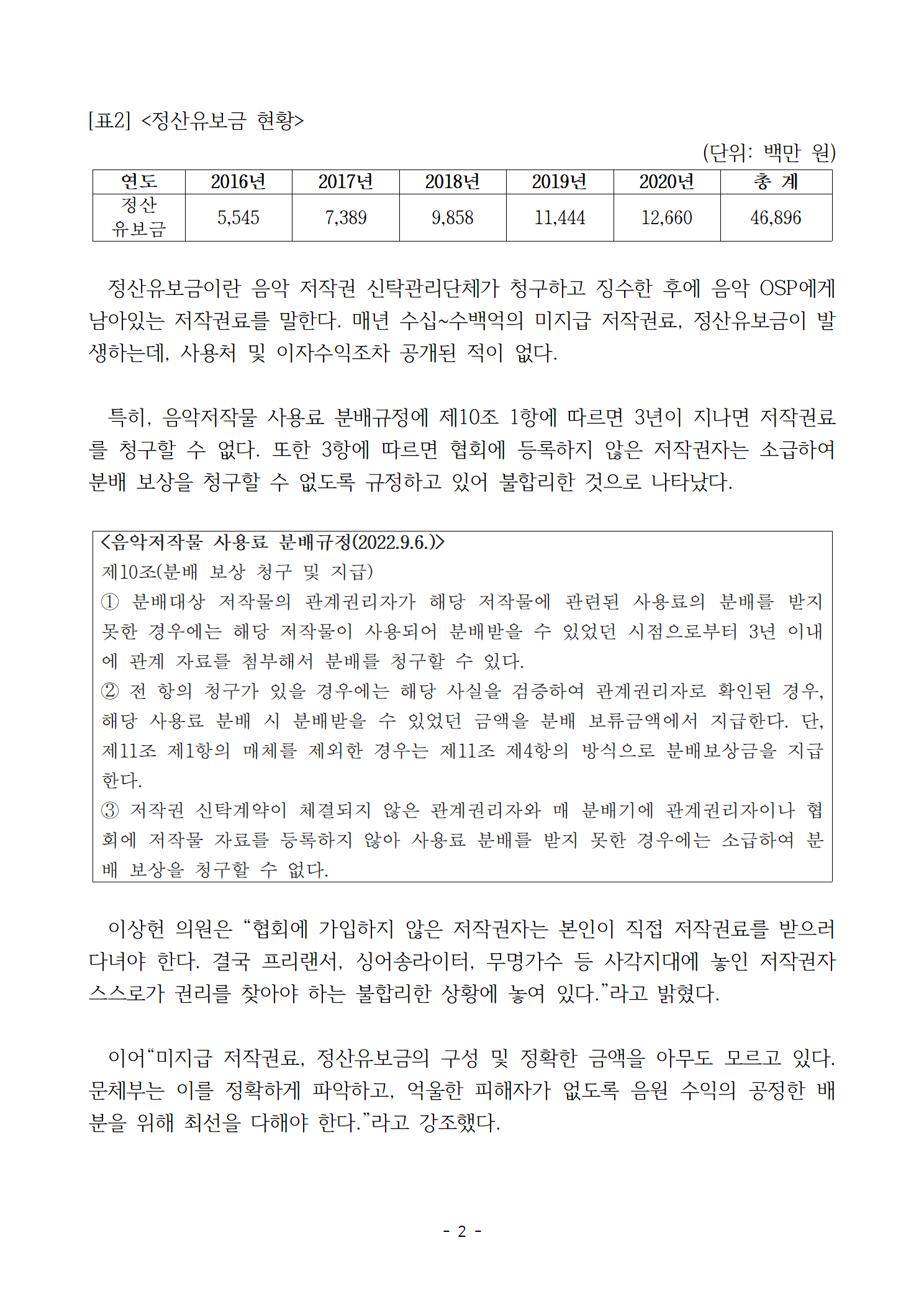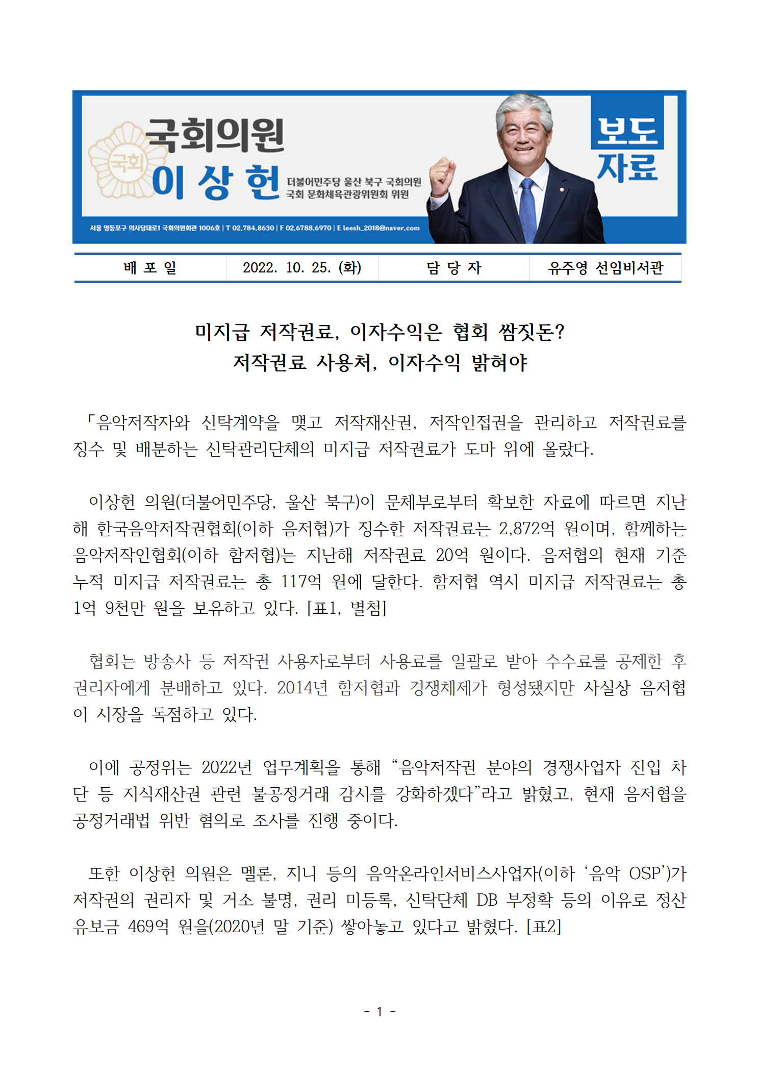 이상헌의원보도자료_221025_미지급_저작권료,_이자수익은_협회_쌈짓돈_저작권료_사용처,_이자수익_밝혀야.hwp
