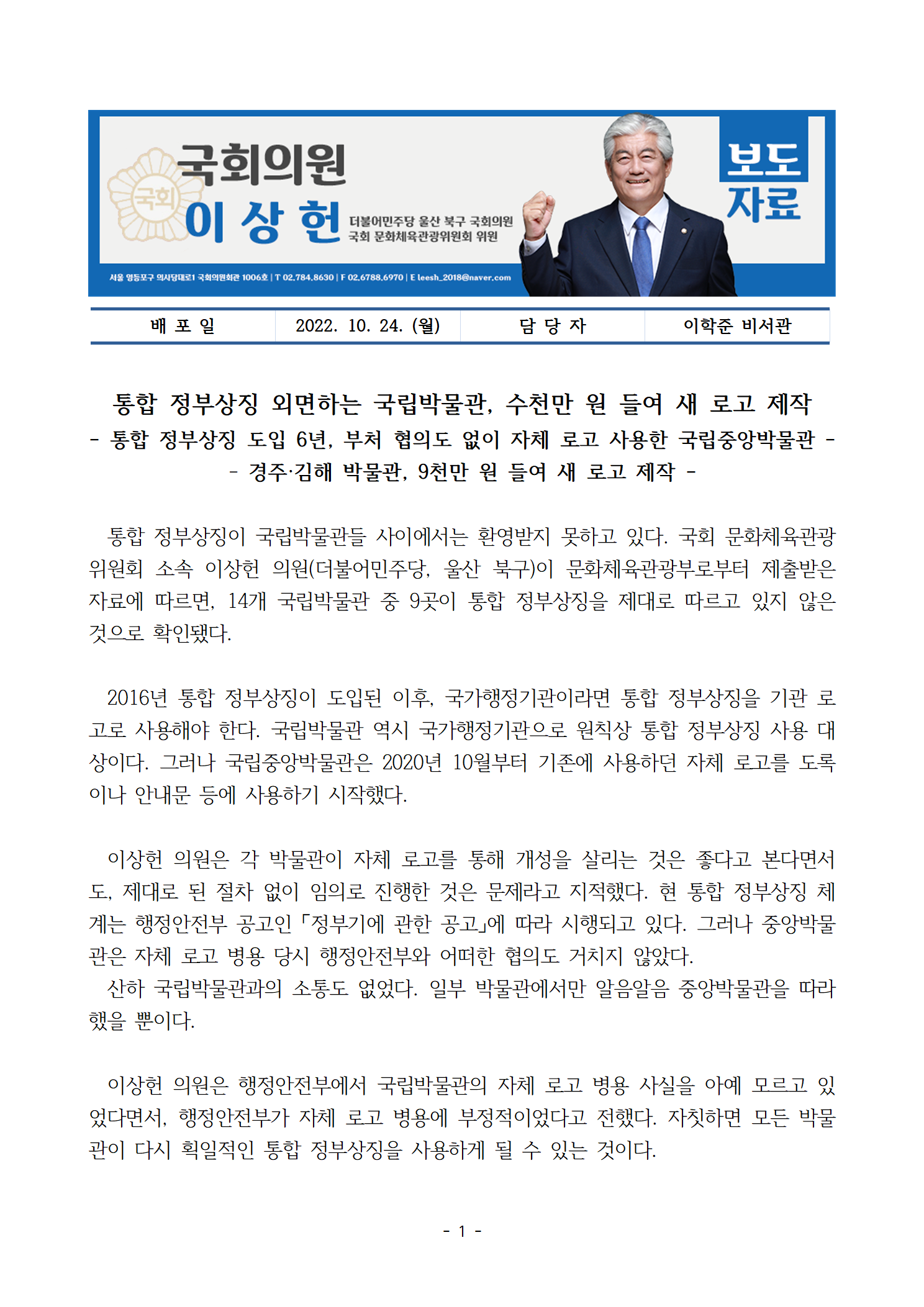 이상헌_의원_보도자료_221024_통합_정부상징_외면한_국립박물관,_수천만원_들여_새_로고_제작.hwp