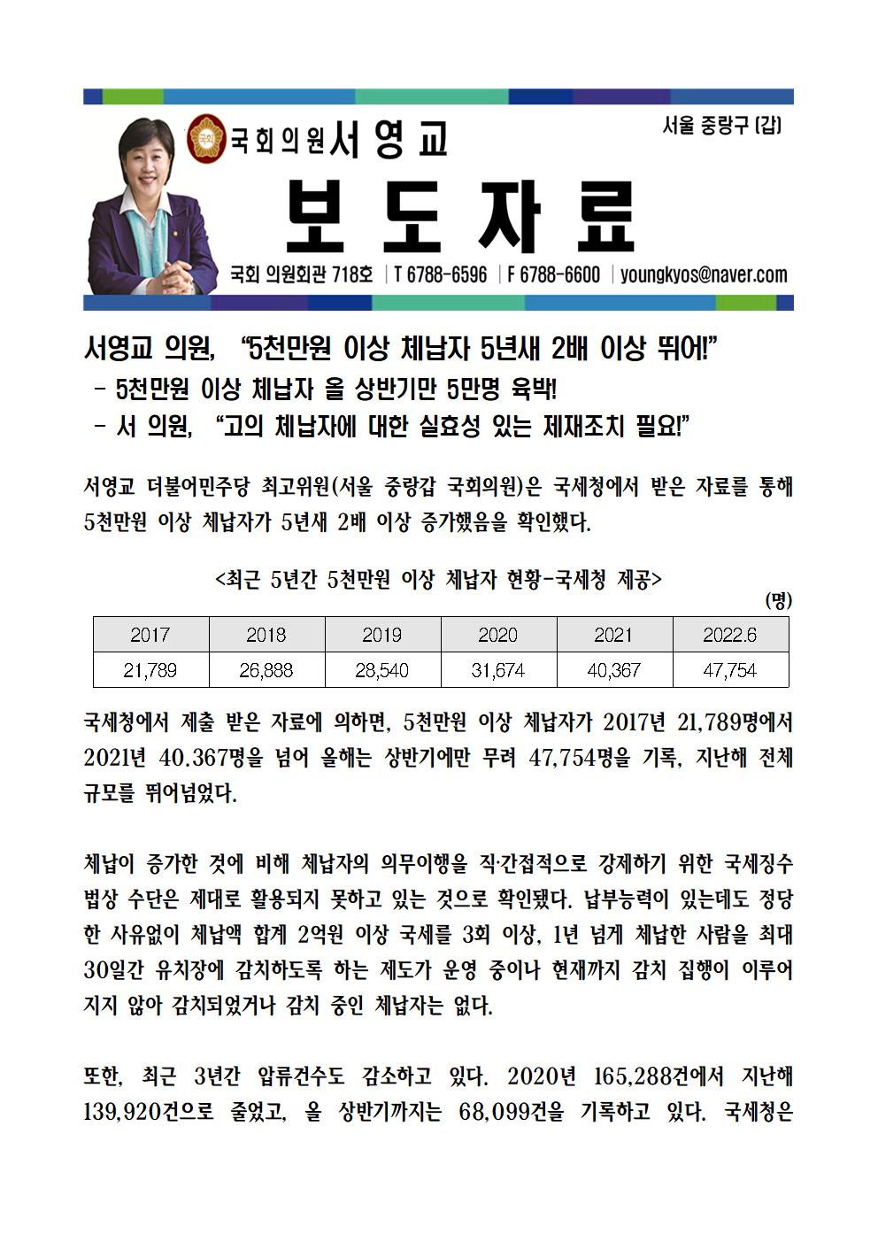 [국회의원 서영교 보도자료] 5천만원 이상 체납자 5년새 2배 이상 뛰어!”