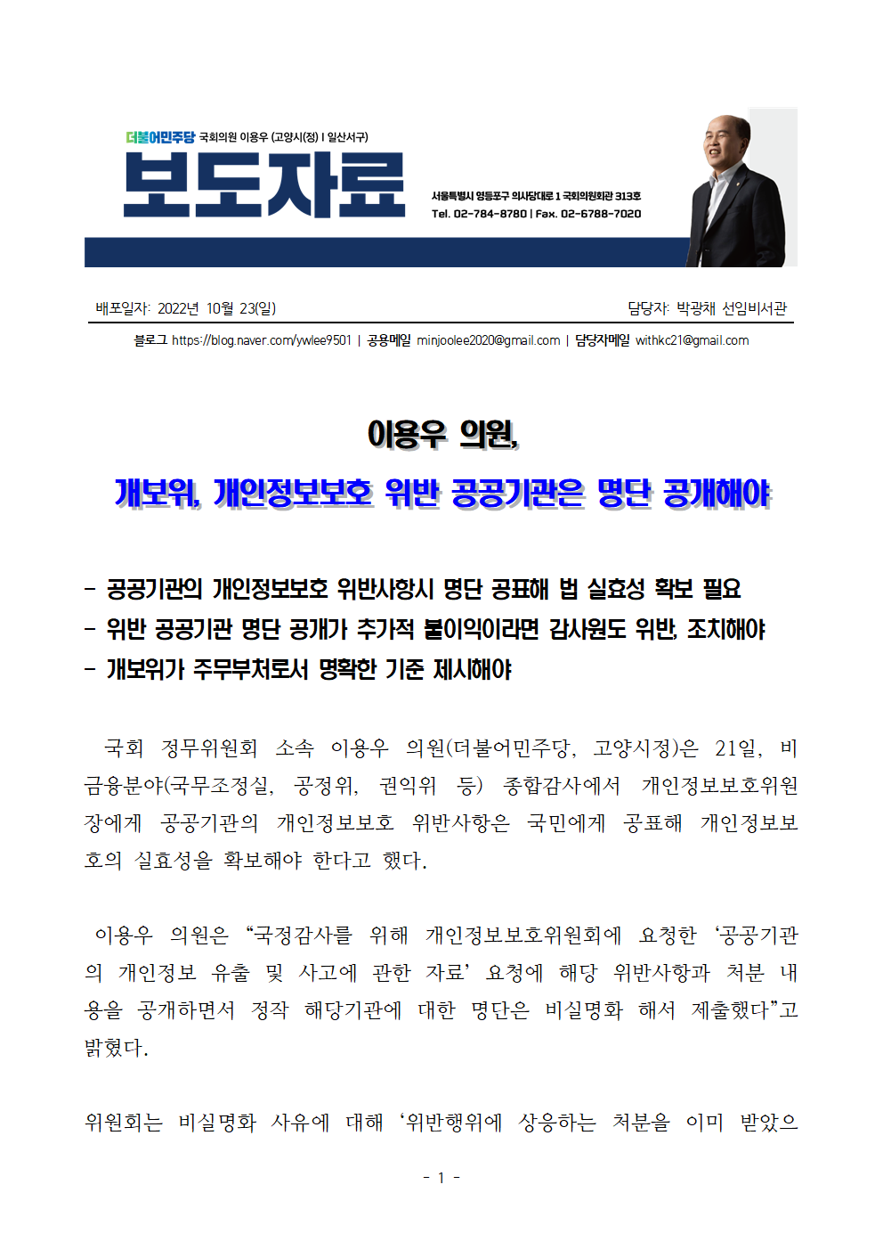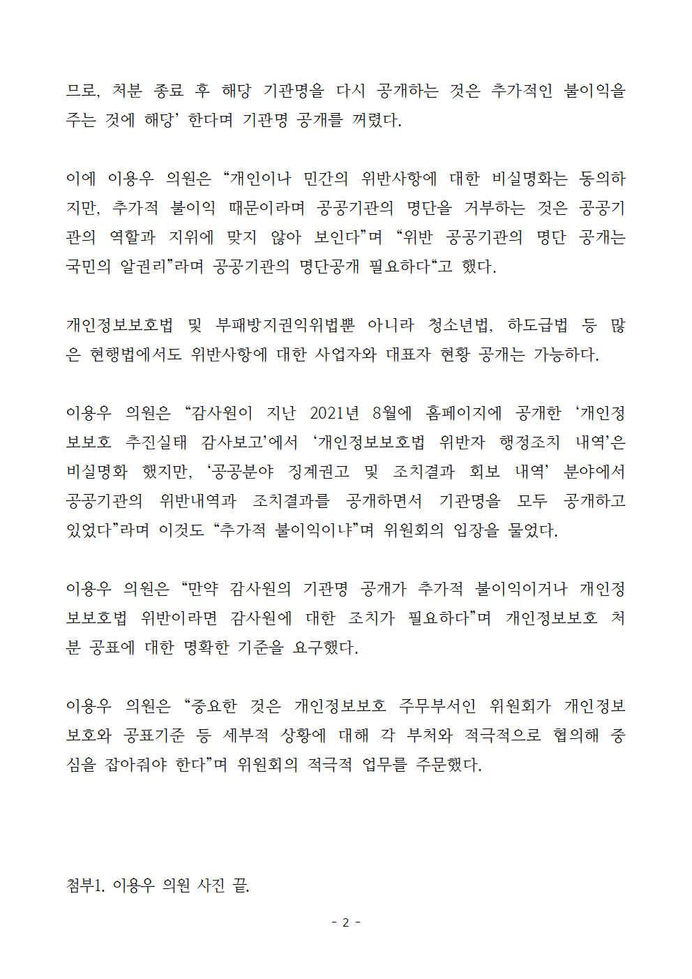 [이용우 의원 보도자료] 개보위, 개인정보 보호 위반 공공기관은 명단 공개해야