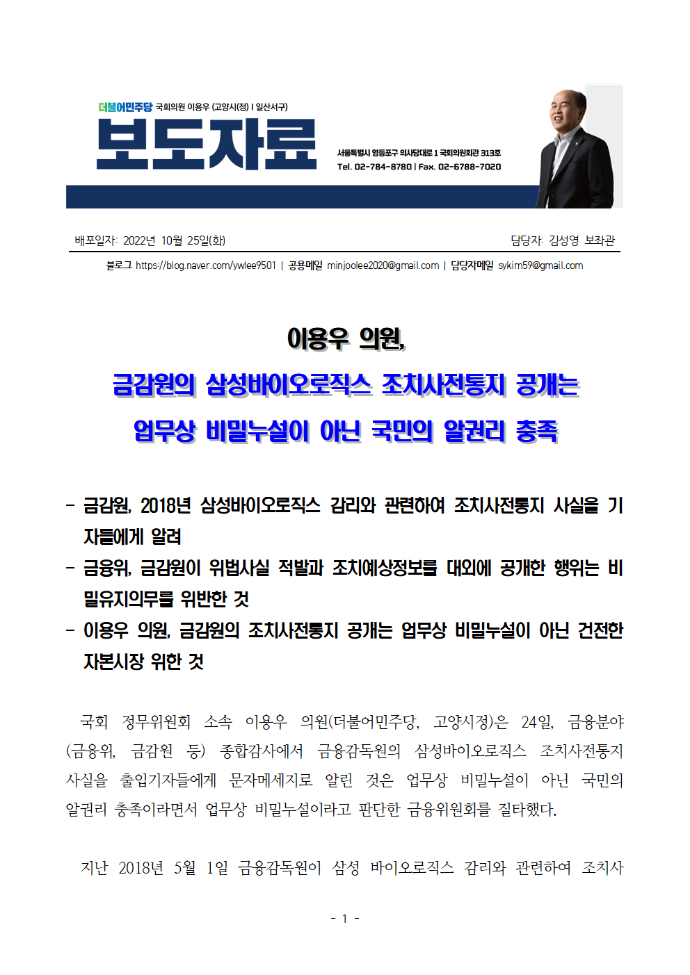 [이용우 의원 보도자료] 금감원의 삼성바이오로직스 조시 사전통지 공개는 업무상 비밀누설이 아닌 국민의 알권리 충족