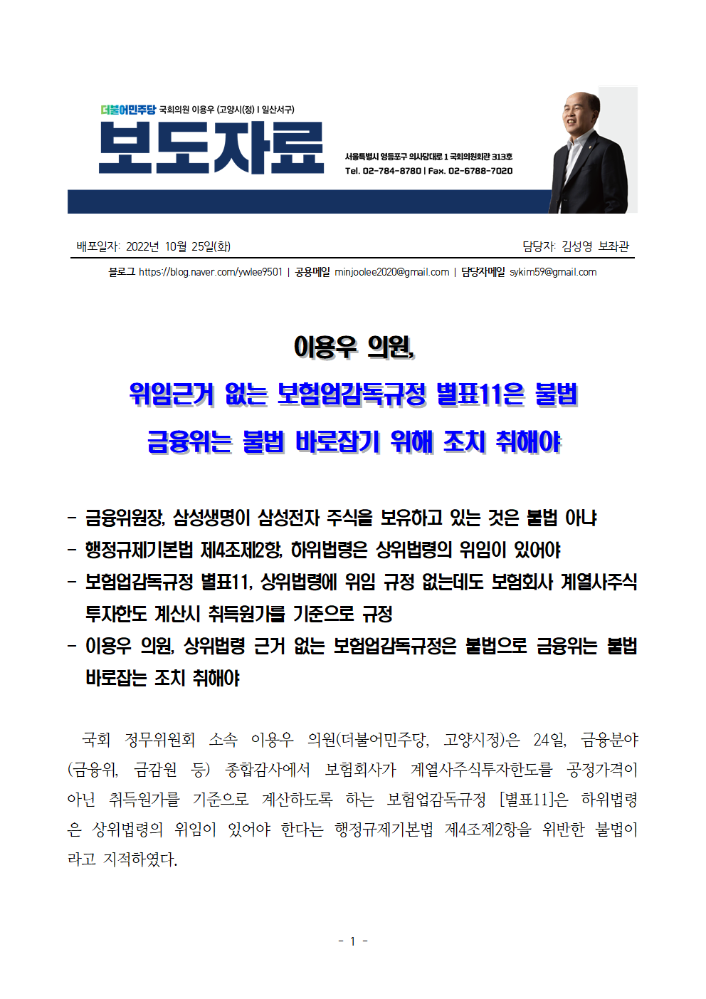 [이용우 의원 보도자료] 위임 근거 없는 보험업법감독규정 별표11은 불법, 금융위는 불법 바로잡기 위해 조치 취해야
