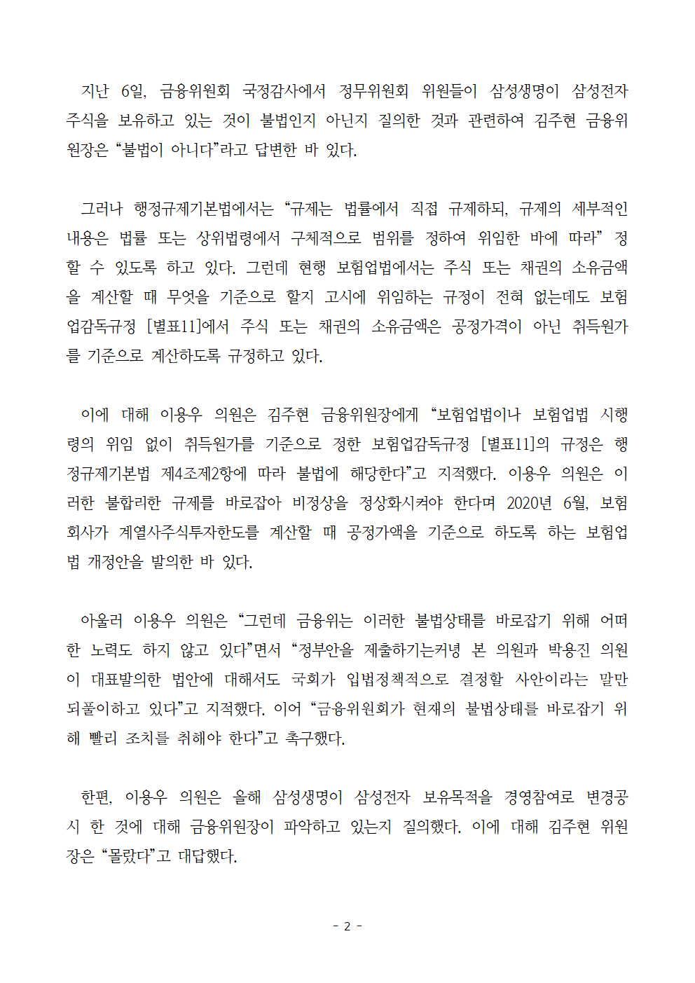 [이용우 의원 보도자료] 금감원의 삼성바이오로직스 조시 사전통지 공개는 업무상 비밀누설이 아닌 국민의 알권리 충족