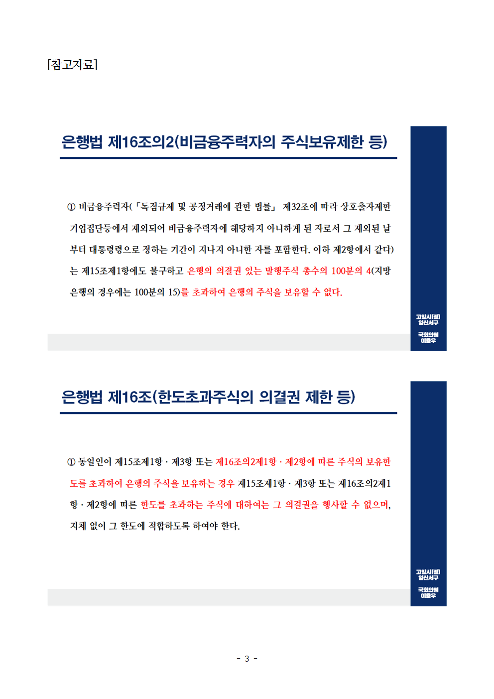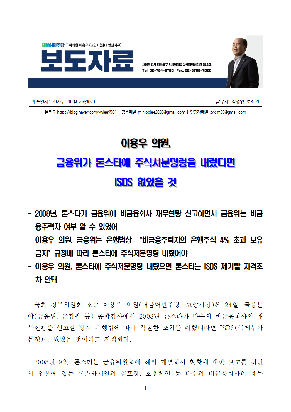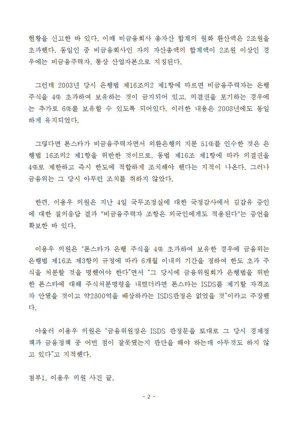 [이용우 의원 보도자료] 이용우 의원, 금융위가 론스타에 주식처분명령을 내렸다면 ISDS 없었을 것