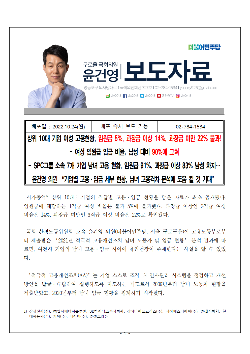[국회의원 윤건영 보도자료] 상위 10대 기업 여성 고용현황, 임원급 5%, 과장급 이상 14%, 과장급 미만 22% 불과!
