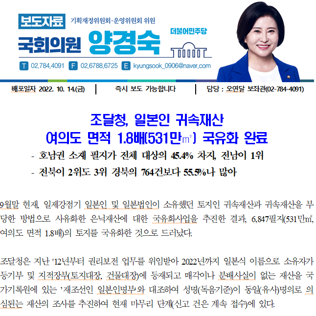 221014_양경숙의원실_보도자료,_조달청,_일본인_귀속재산_여의도_면적_1_8배(531만㎡)_국유화_완료.hwp