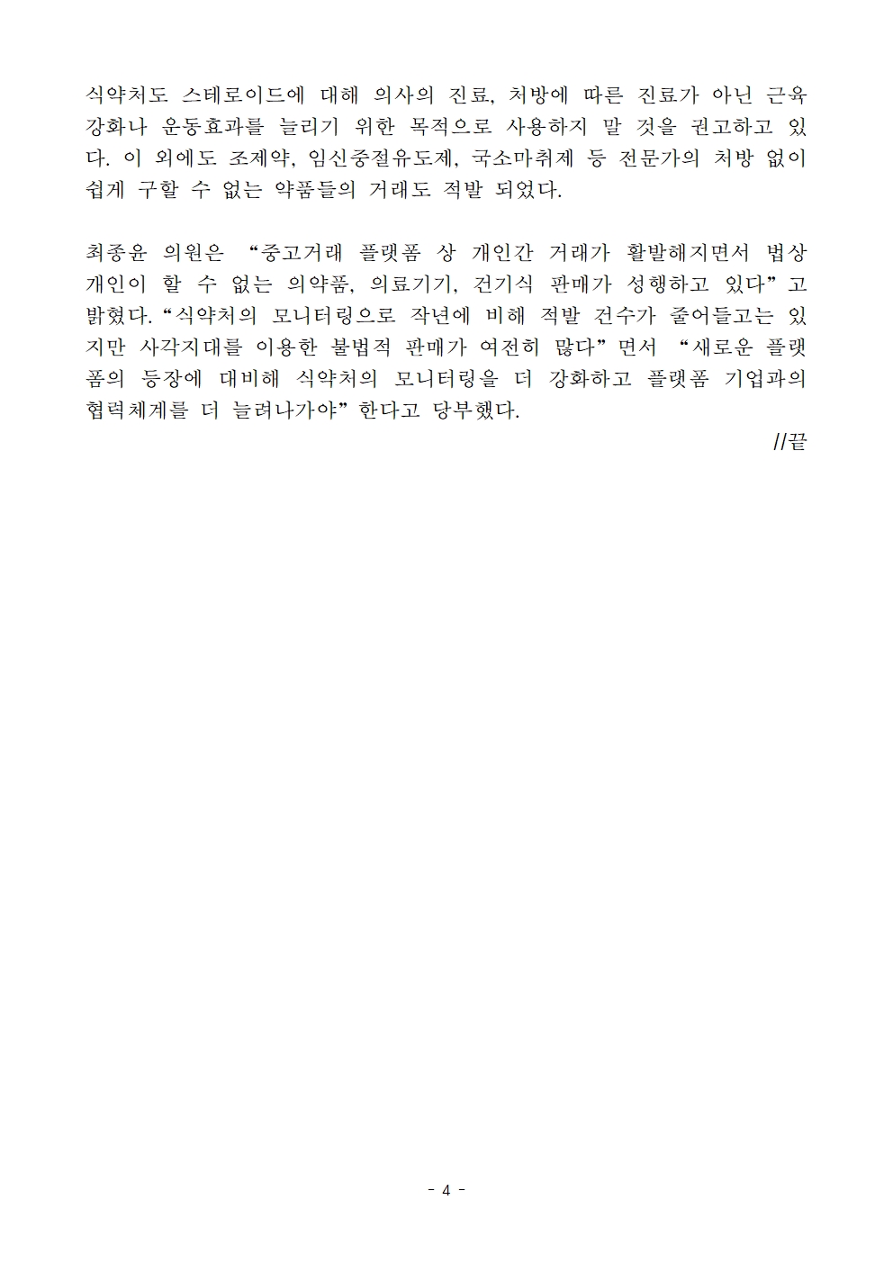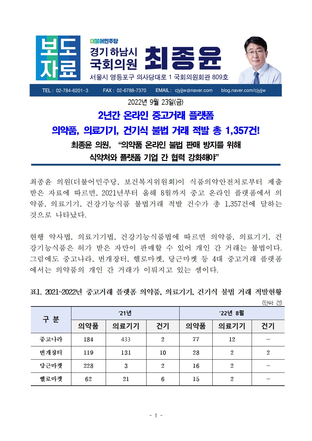[국회의원 최종윤 보도자료] 2년간 온라인 중고거래 플랫폼 의약품, 의료기기, 건기식 불법 거래 적발 총 1,357건!