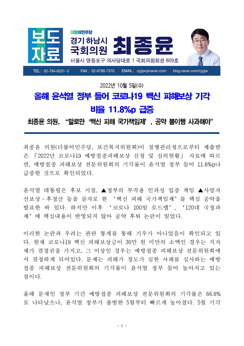 [국회의원 최종윤 보도자료] 올해 윤석열 정부 들어 코로나19 백신 피해보상 기각 비율 11.8%p 급증