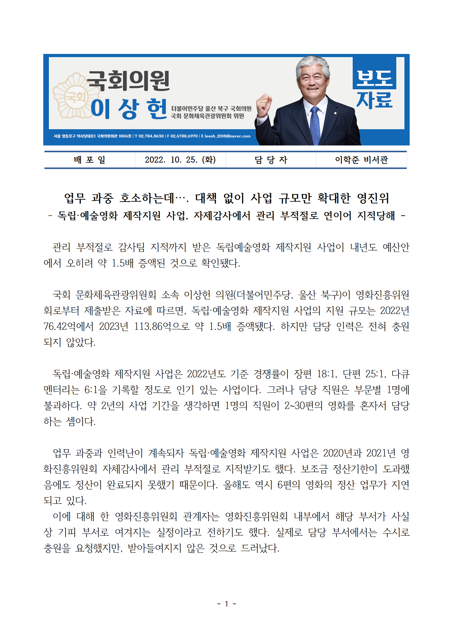 이상헌_의원_보도자료_221025_업무_과중_호소하는데···__대책_없이_사업_규모만_확대한_영진위.hwp