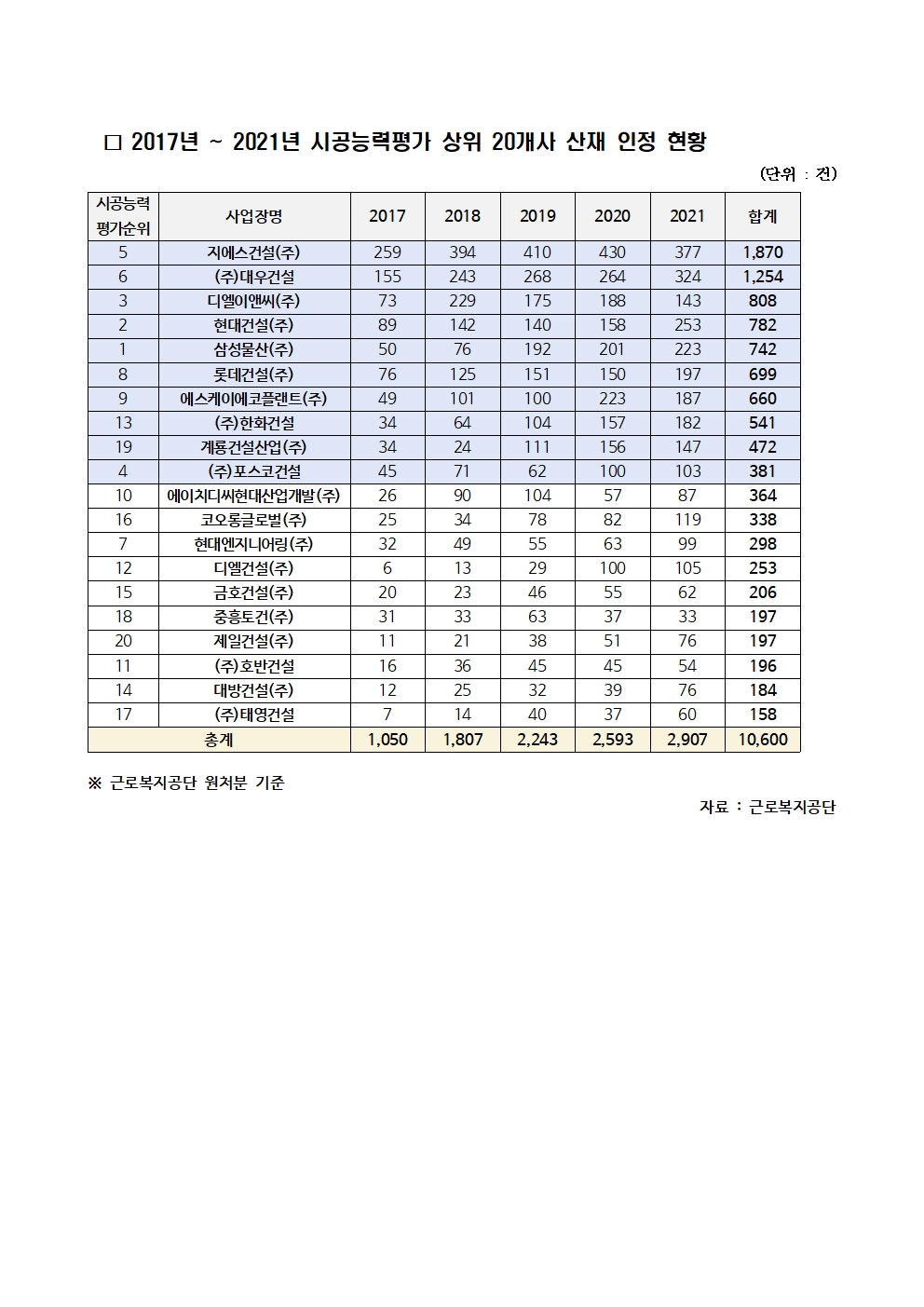 [민홍철 의원실보도자료]최근 5년간 LH·민간건설사 모두 산재 2.8배 이상 급증