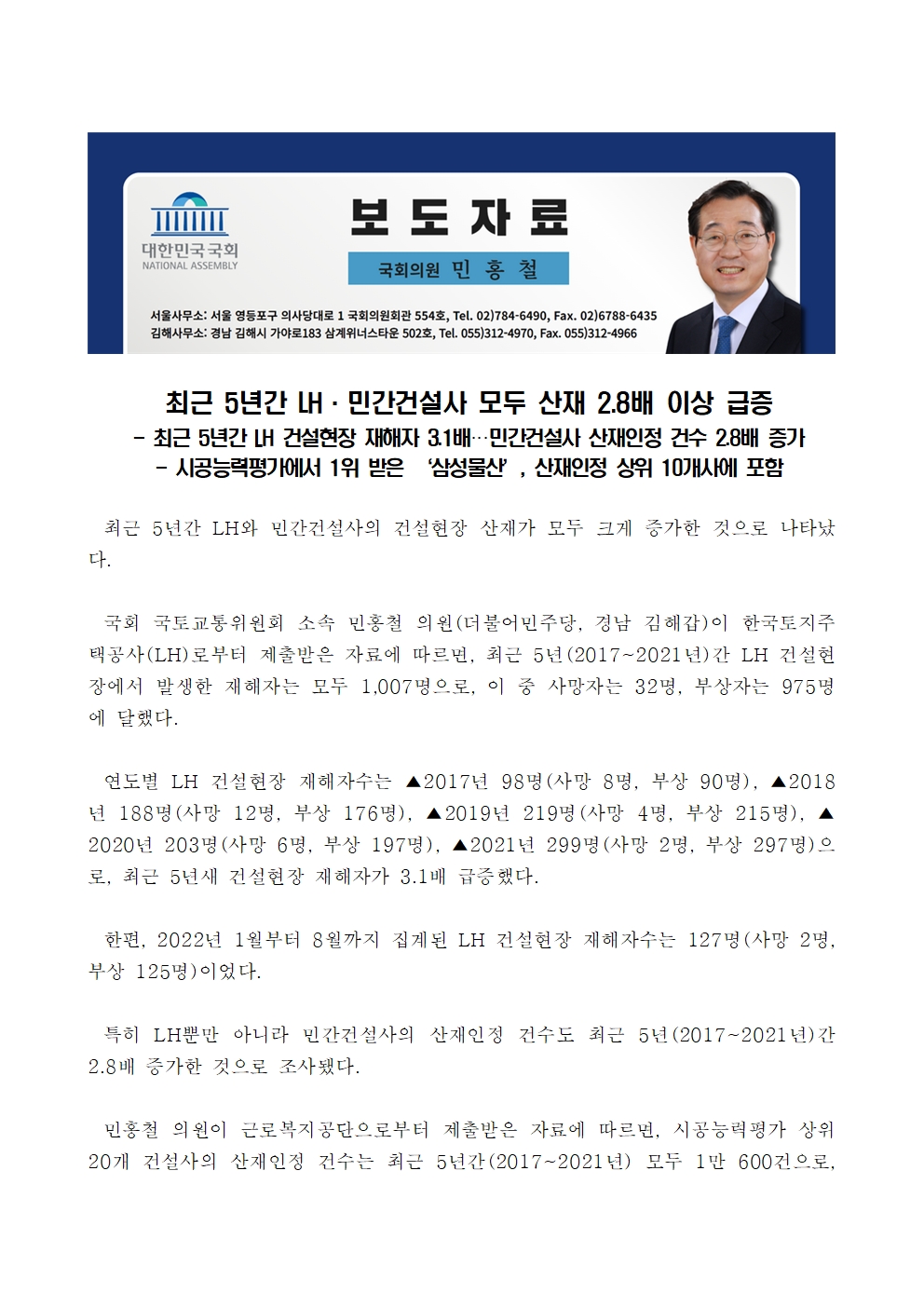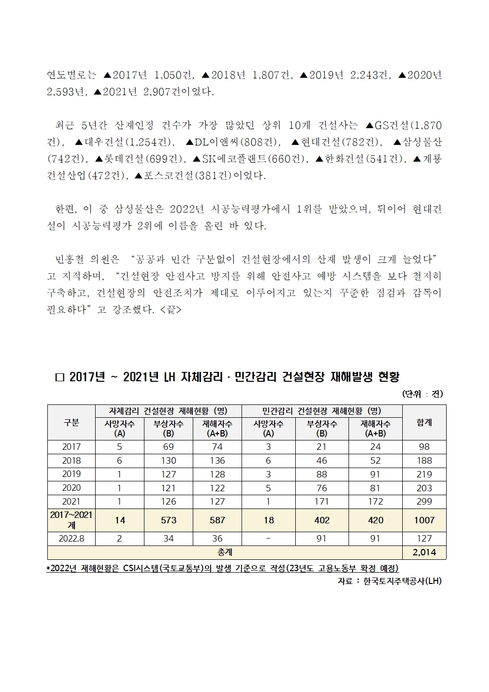 2022-10-19_보도자료_최근_5년간_LH·민간건설사_모두_산재_2_8배_이상_급증(민홍철의원실).hwp