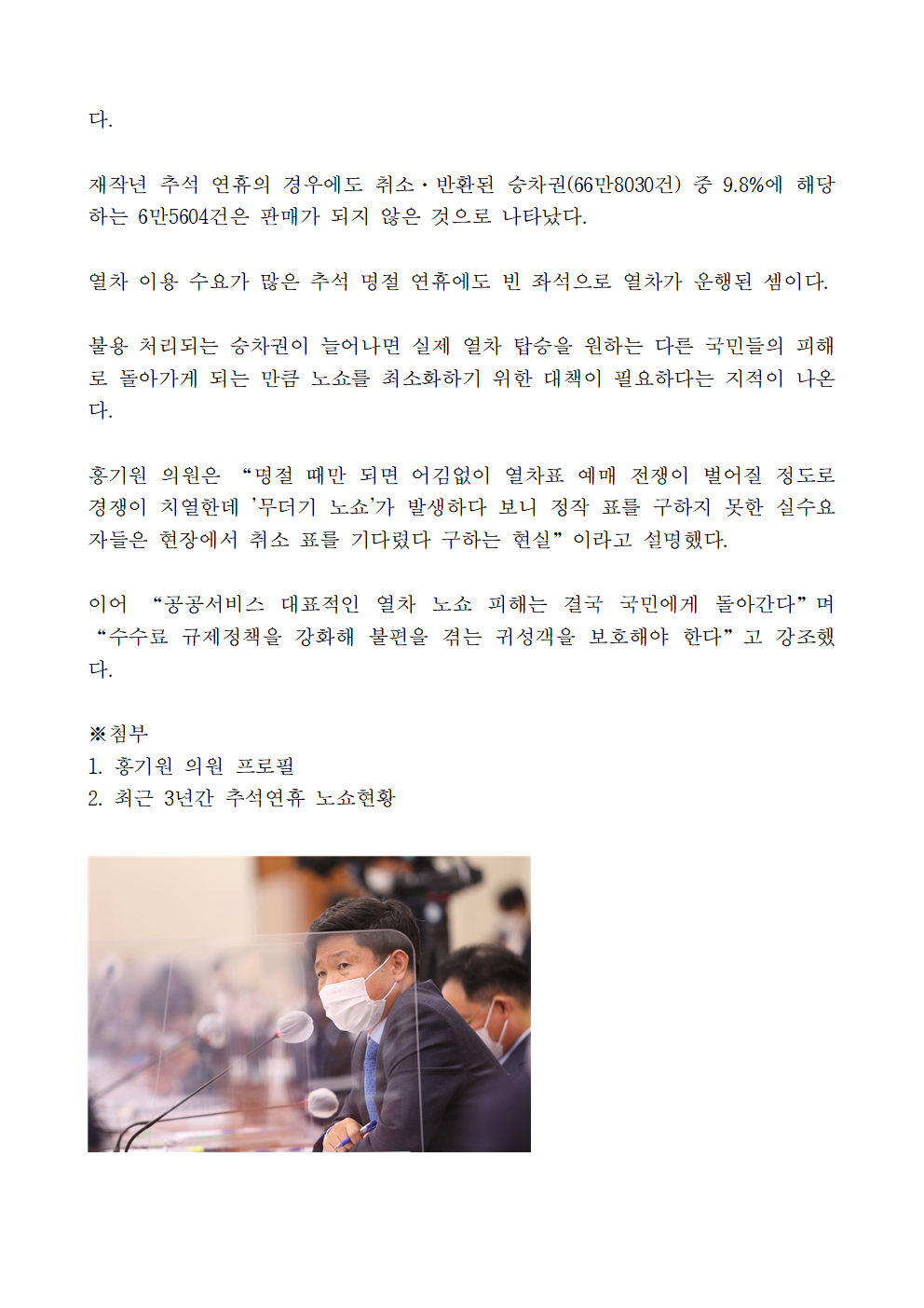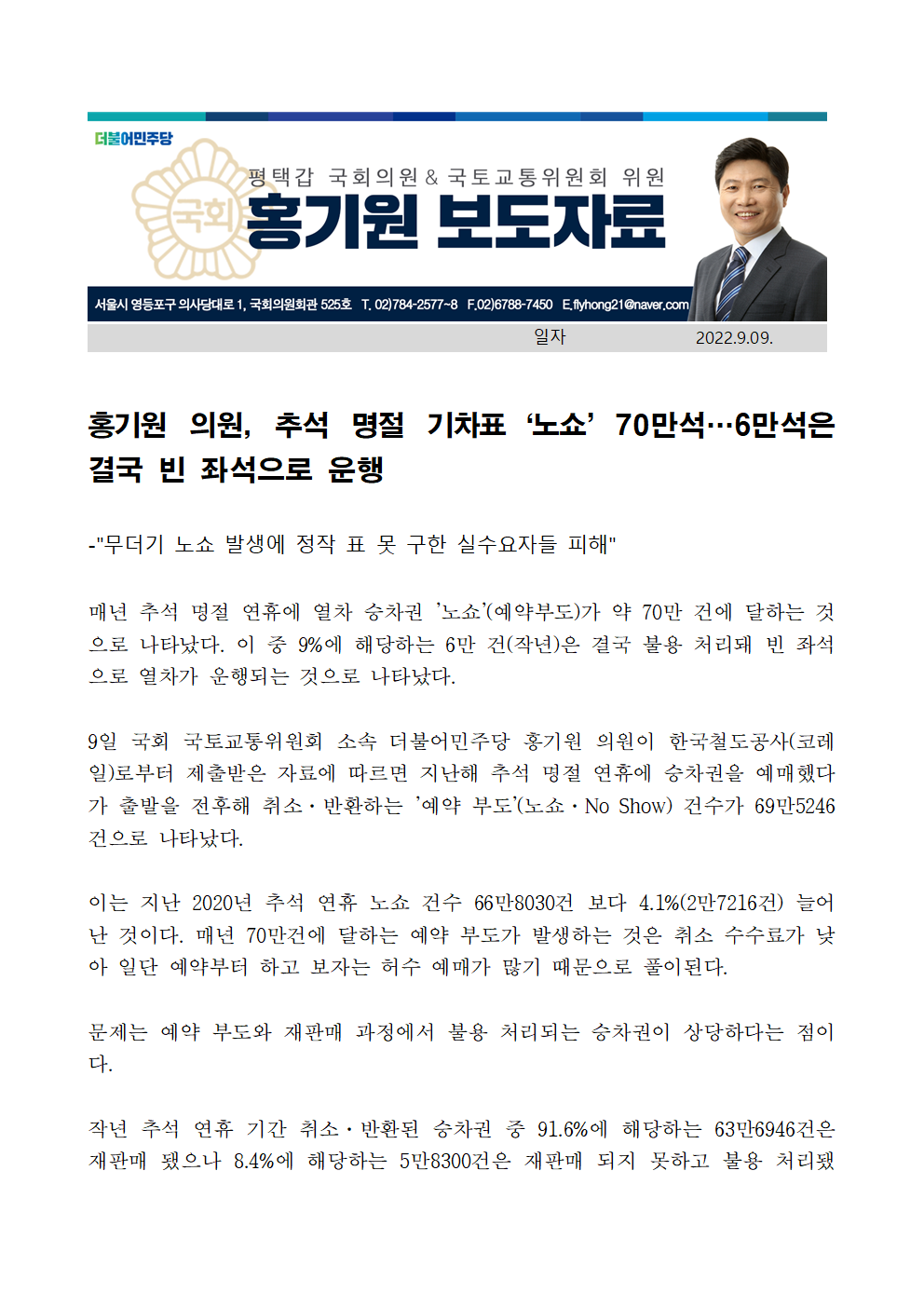 220909보도자료홍기원_의원,_추석_명절_기차표_‘노쇼’_70만석_6만석은_결국_빈_좌석으로_운행.hwp