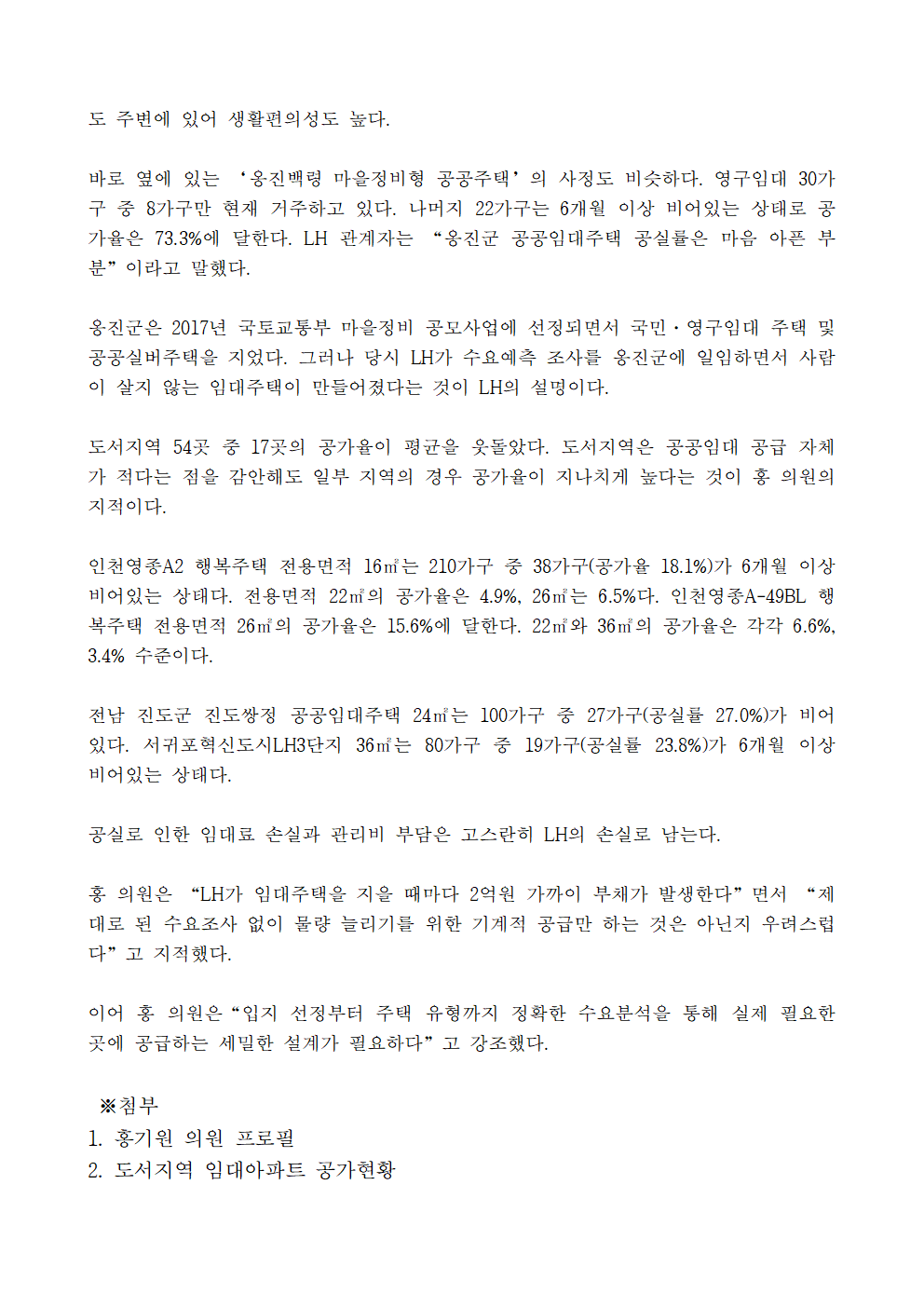 [홍기원의원 국정감사 보도자료] 홍기원 의원, 섬에도 공공임대주택 빈집 수두룩