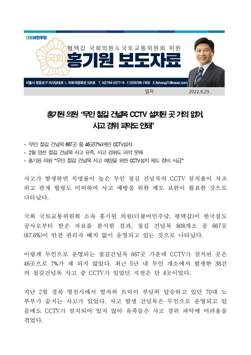 220929보도자료홍기원_의원“무인_철길_건널목_CCTV_설치된_곳_거의_없어,_사고_경위_파악도_안돼”.hwp