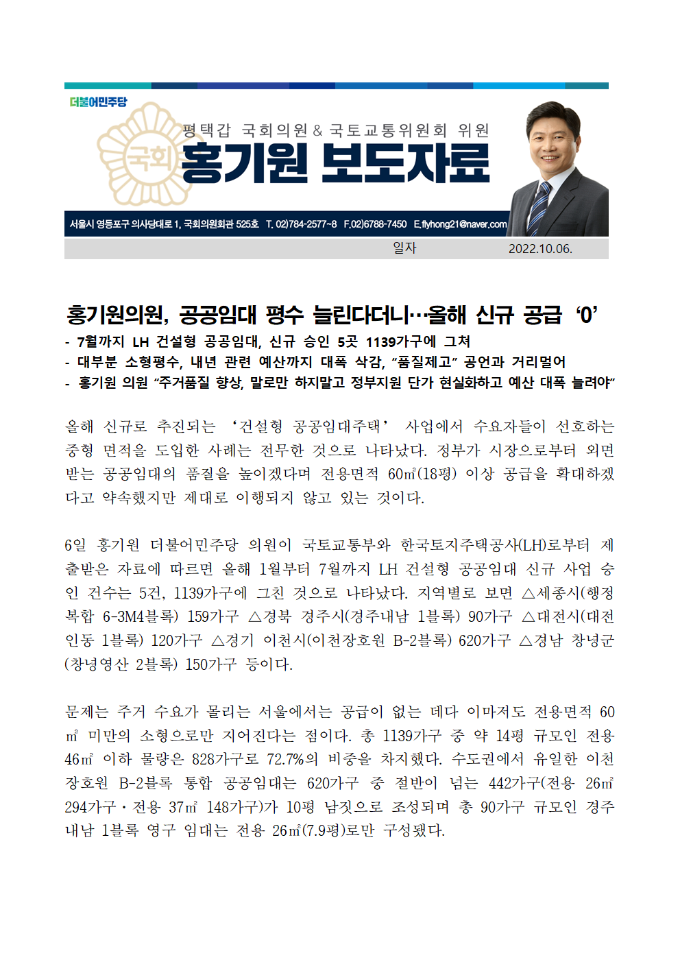 [홍기원의원 국정감사 보도자료] 홍기원의원, 공공임대 평수 늘린다더니…올해 신규 공급‘0’