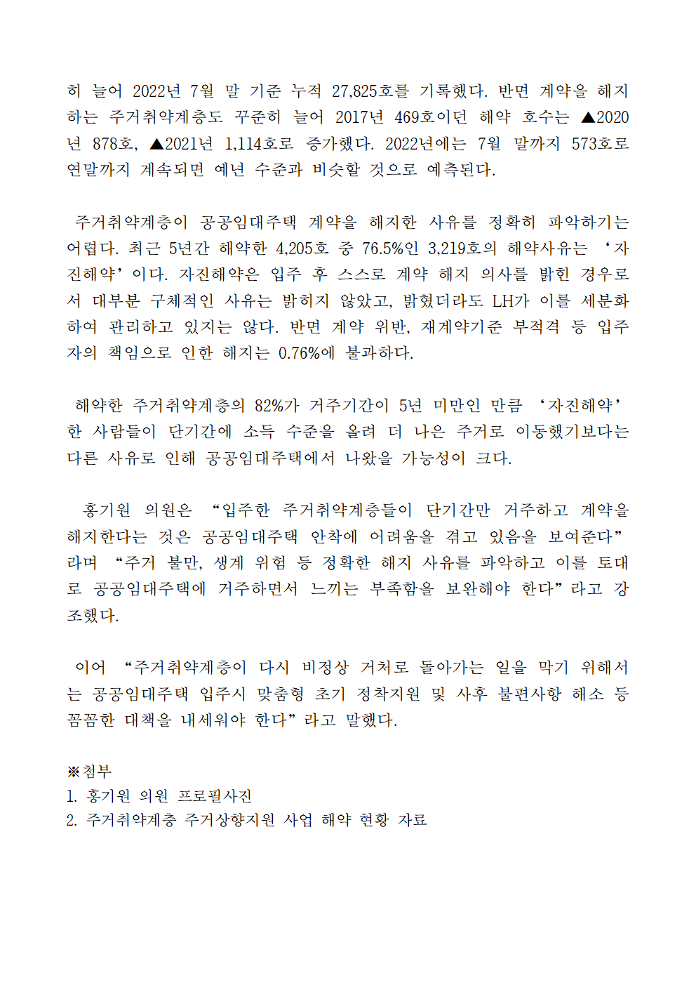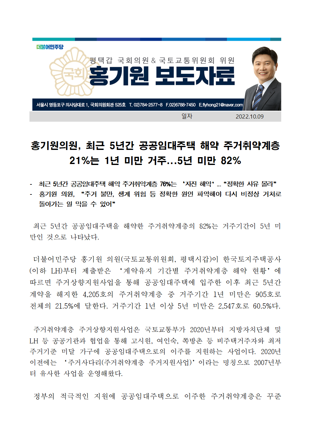 221009보도자료_홍기원의원,_최근_5년간_공공임대주택_해약_주거취약계층_21%는_1년_미만_거주___5년_미만_82%.hwp