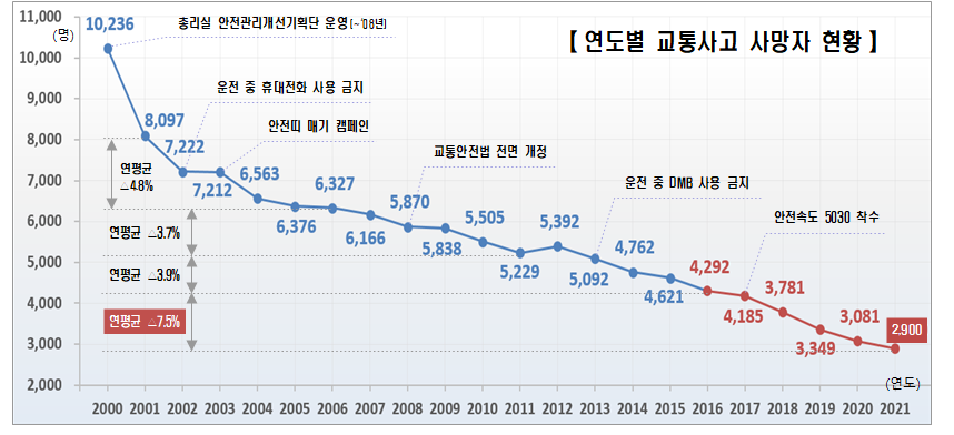 전체 교통사고 사망자는 ’16년 4,292명에서 ’21년 2,900명으로 32.4% 감소(연평균 7.5%)하여, 통계 작성 이래 최저치이자 역대 처음으로 2,000명대에 진입했습니다. 그러나, 인구 10만명당 사망자(6.5명, 27위)로 OECD 평균(5.2명)에 못미침.